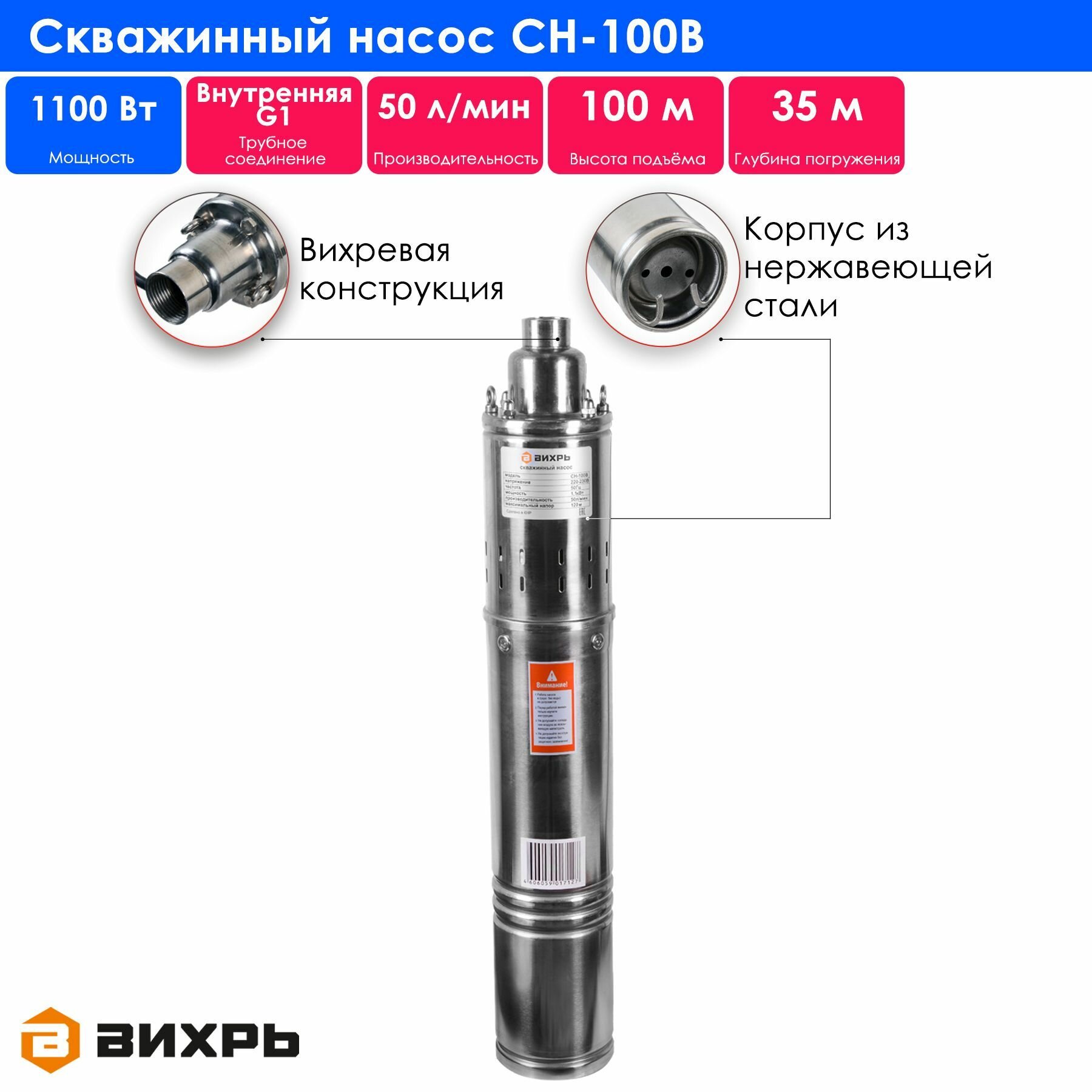 Скважинный насос Вихрь СН-100В, 1100 Вт, высота подъема – 120 м, 50 л/мин, 1”