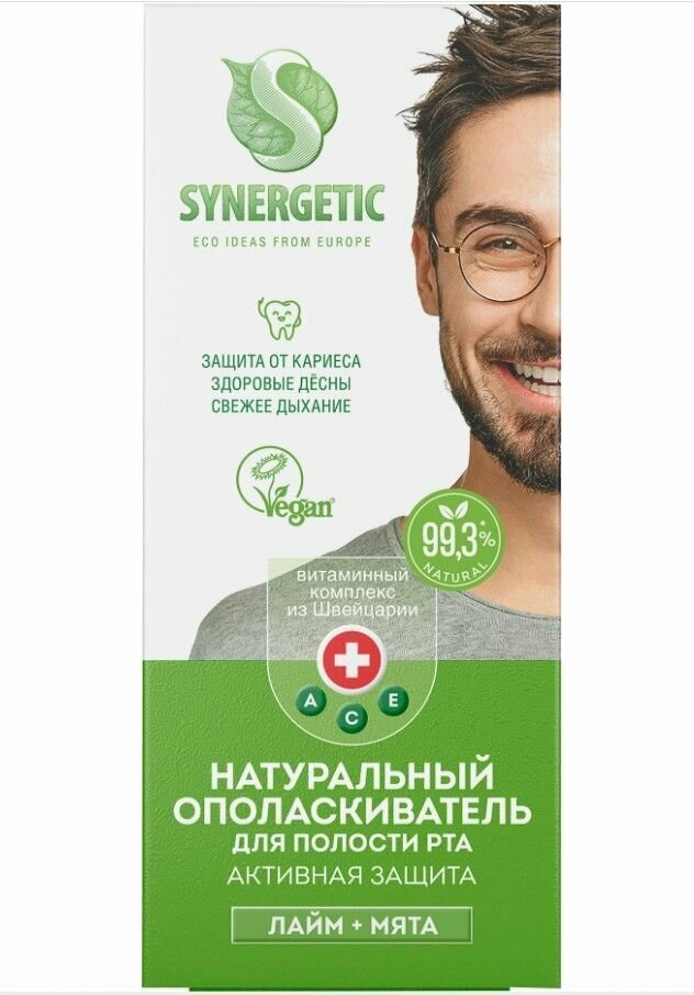 Ополаскиватель для полости рта SYNERGETIC Активная защита лайм+мята, без фтора, защита от кариеса, 200мл 4607971451662
