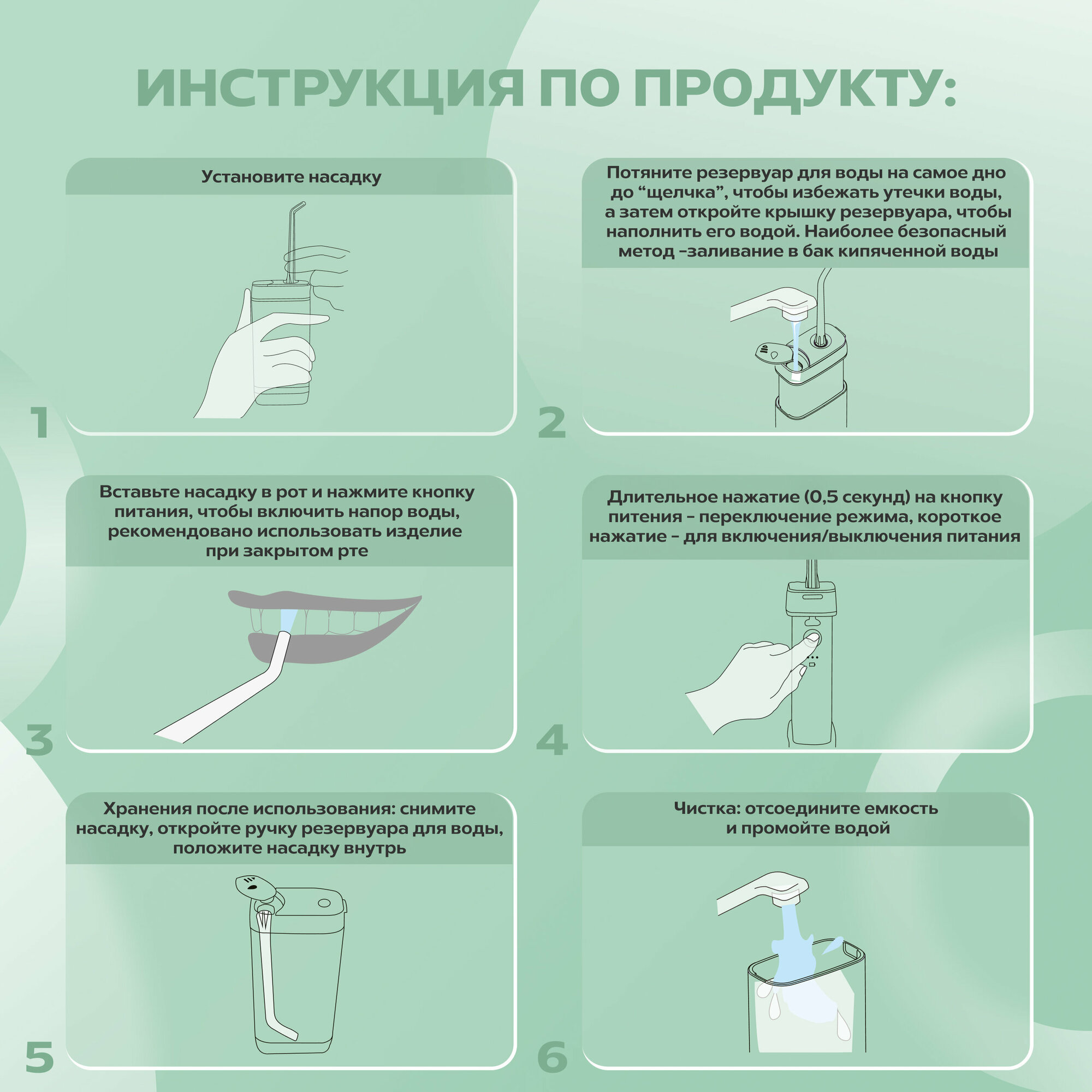 | Насадки | для струйной чистки / для чистки языка / ортодонтическая (для брекетов) / пародонтологическая (для десен) |