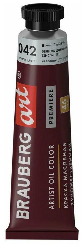 Краска масляная художественная BRAUBERG ART PREMIERE 46 мл, проф. серия, белила цинковые, 191397