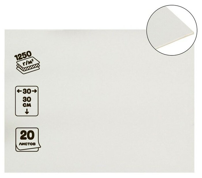 Картон переплетный 2.0 мм, 30 х 40 см, 20 листов, 1250 г/м², белый