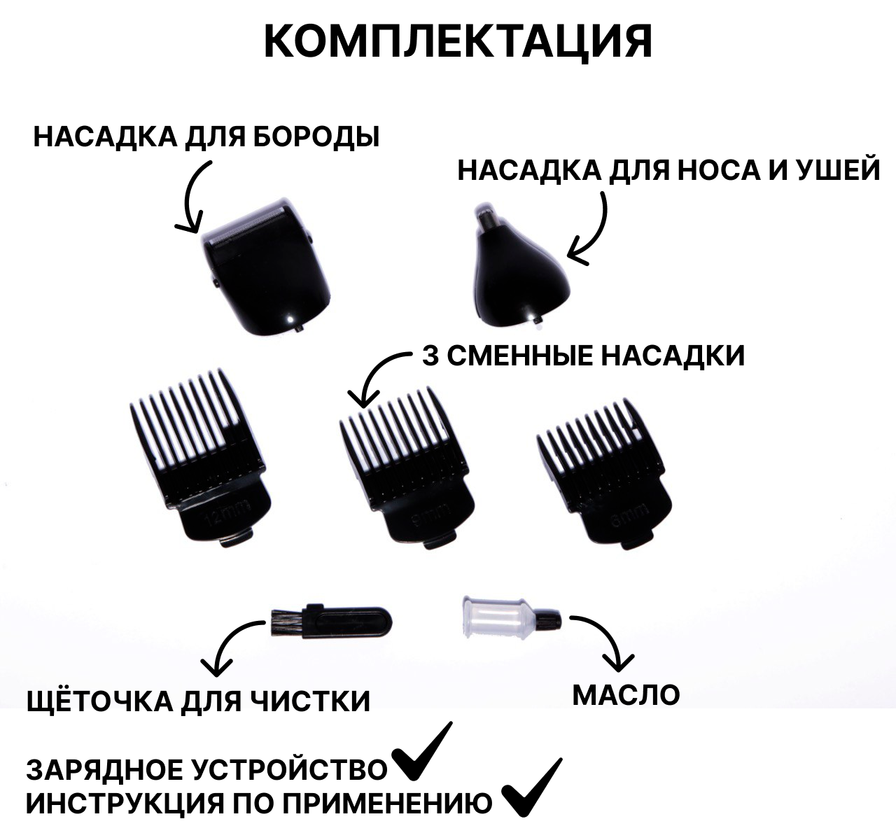 | В комплекте | кабель для зарядки / масло / насадка для бороды / насадка для носа / насадка для стрижки волос в носу / насадка для ушей / щеточка |