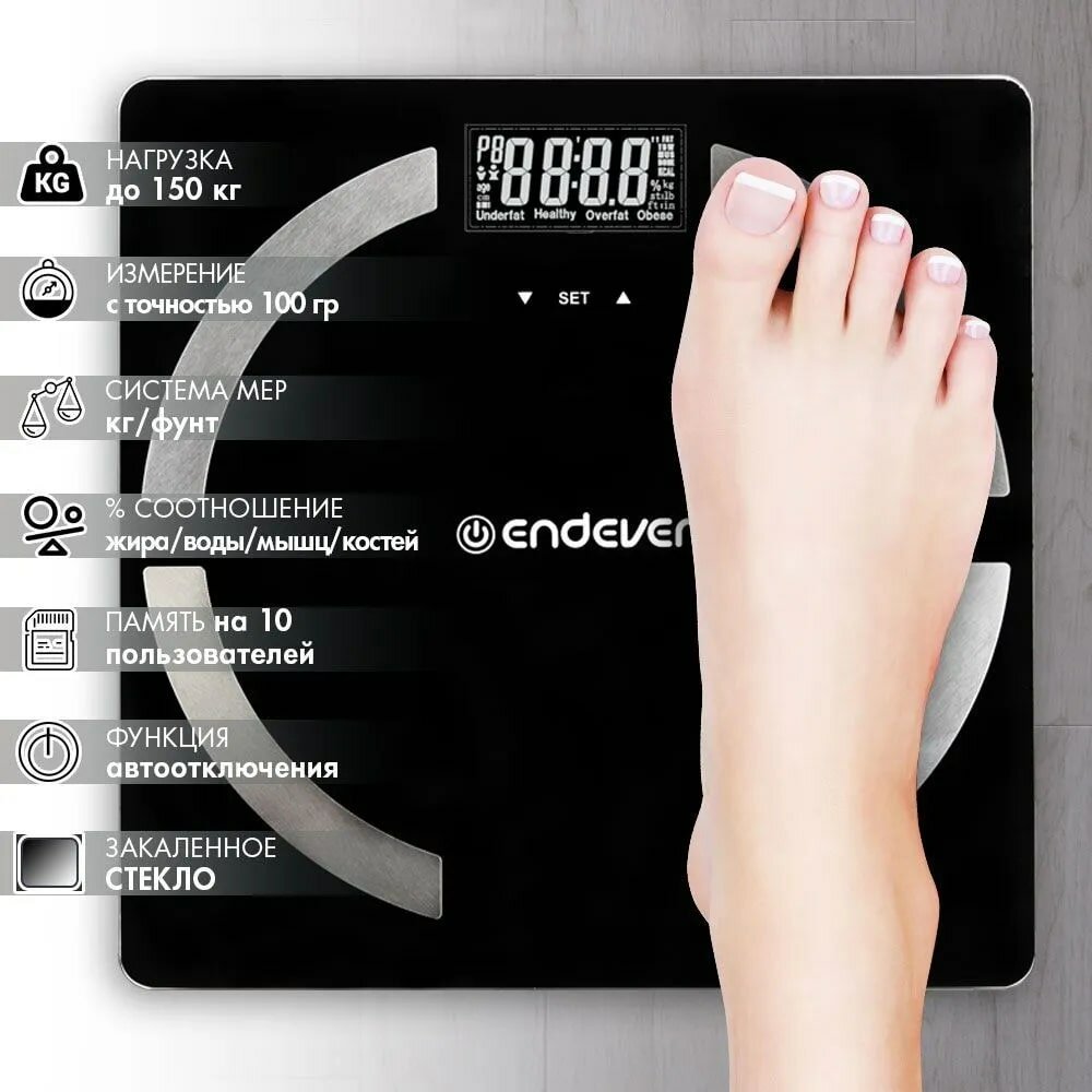 Напольные весы-анализатор Endever Aurora-554 / вес, жир, вода / закаленное стекло / до 150 кг
