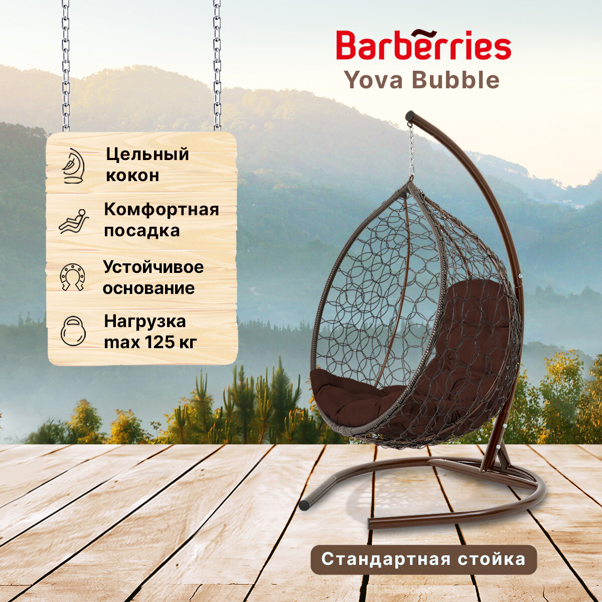 Купить Подвесное кресло кокон садовое Barberries Yova Bubble. Стойка венге до 125 кг, подушка трапеция коричневая