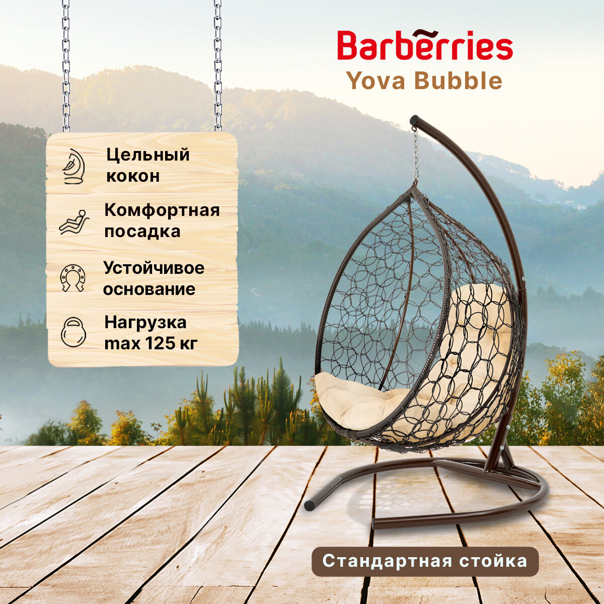 Купить Подвесное кресло кокон садовое Barberries Yova Bubble. Стойка венге до 125 кг, подушка трапеция бежевая