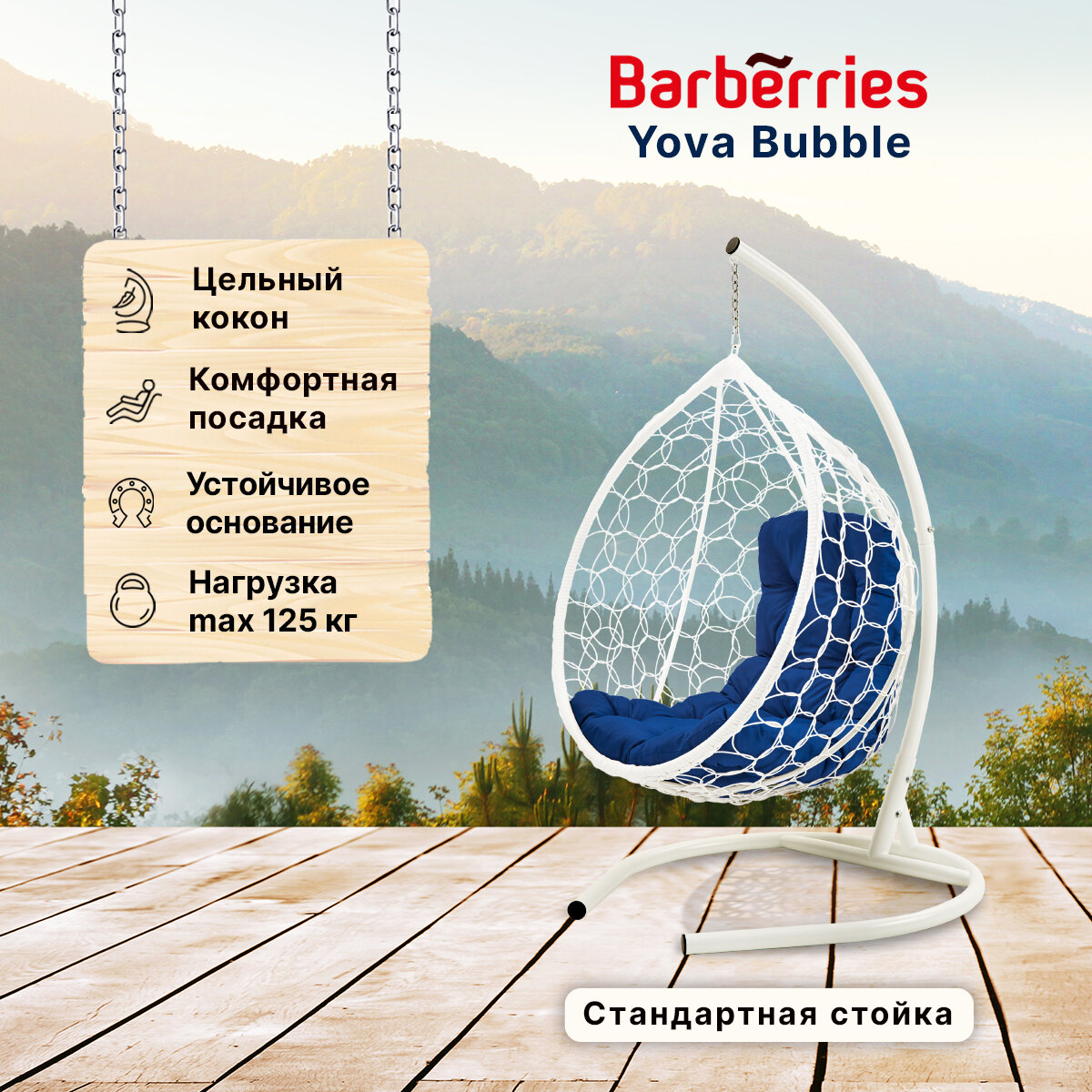 СохранитьПодвесное кресло кокон садовое Barberries Yova Bubble. Стойка белая до 125 кг, подушка трапеция синяя интересное: