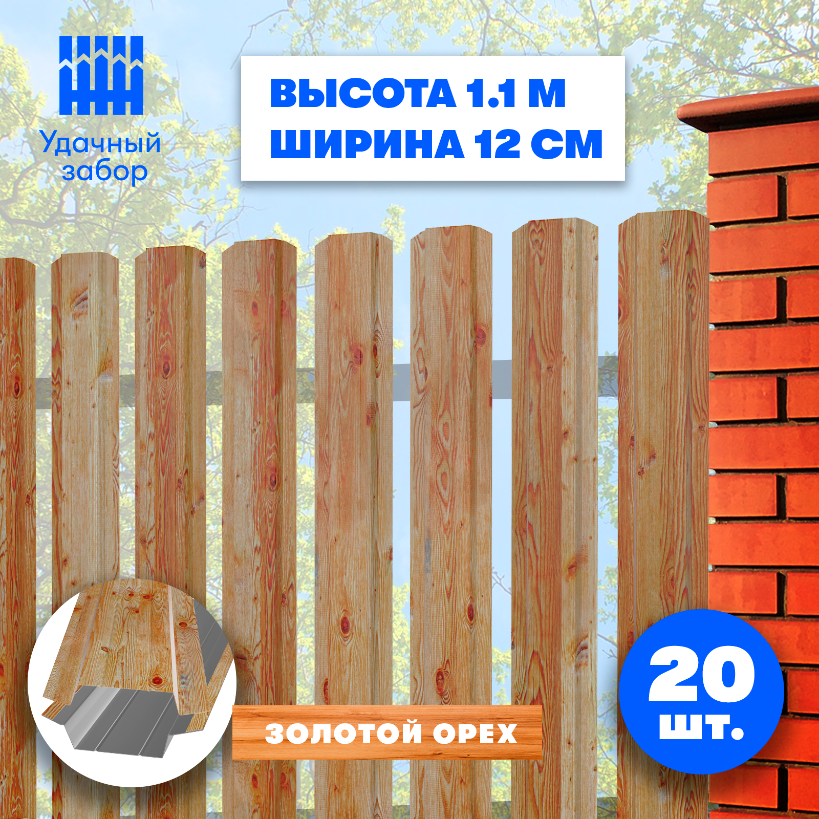 Штакетник металлический Практик (односторонний окрас Принтек - Золотой Орех, высота 1.3 м, ширина планки 9 см, 20 шт., саморезы в комплекте)