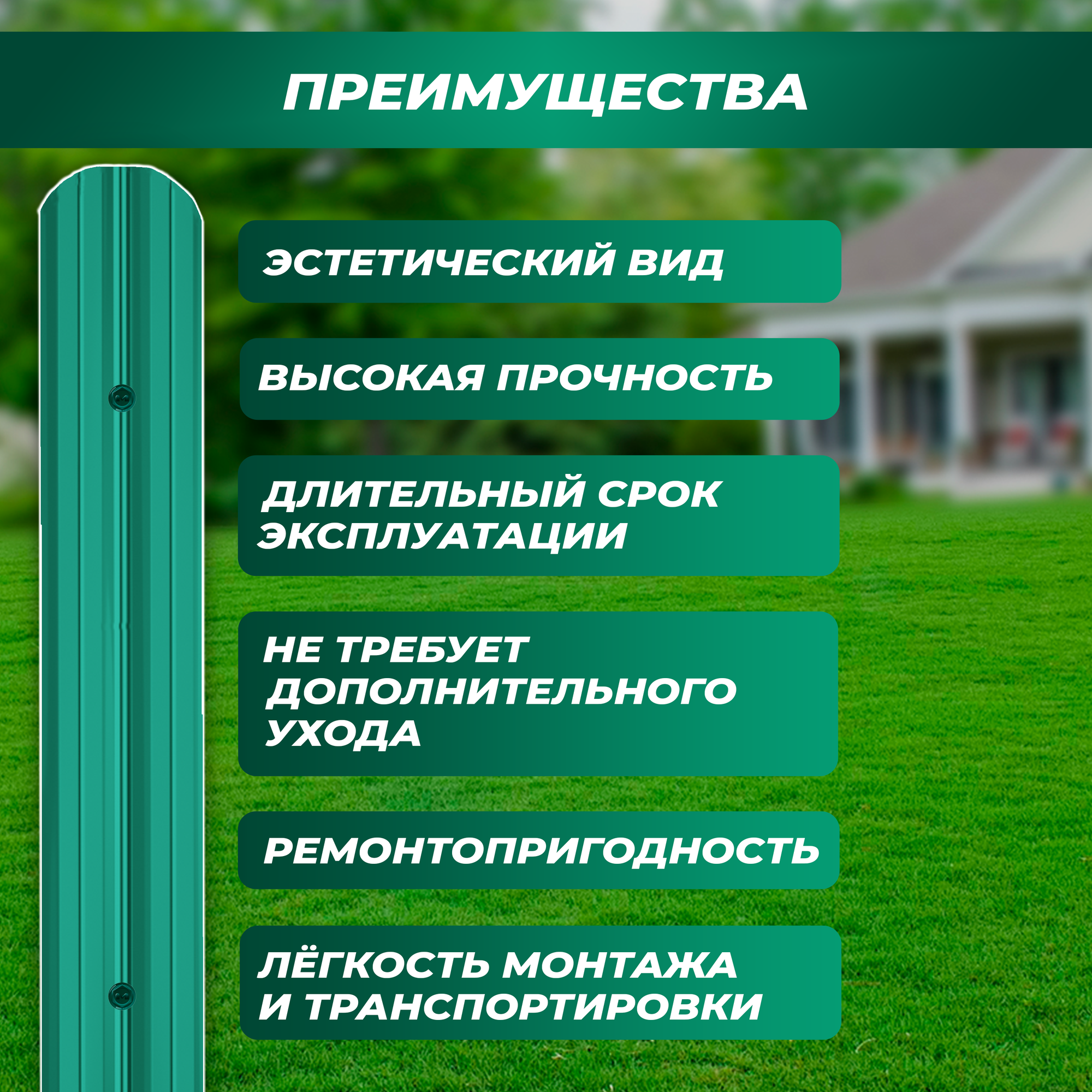 Штакетник металлический Классик (двусторонний окрас, цвет зеленый мох, высота 1.3 м, ширина планки 10 см, 20 шт., саморезы в комплекте)