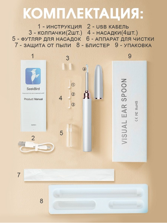 | Комплектация | Аппарат для чистки ушей - 1шт; Силиконовые насадки - 4 шт; Колпачок - 1 шт; USB-кабель - 1шт; Инструкция - 1 шт |