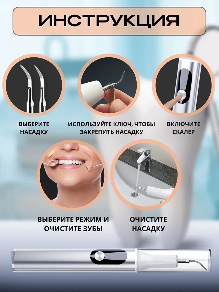 | Подробная комплектация | Скалер, 2 насадки (плоская и заостренная), гаечный ключ, usb кабель, зеркальце, инструкция, коробка. |