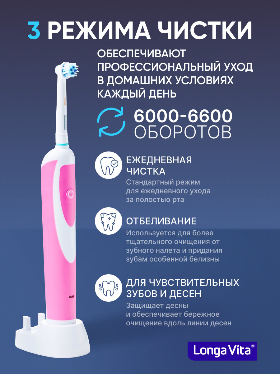 СохранитьЭлектрическая зубная щётка Longa Vita PROFESSIONAL 6 насадок, цвет: белый/розовый интересное: