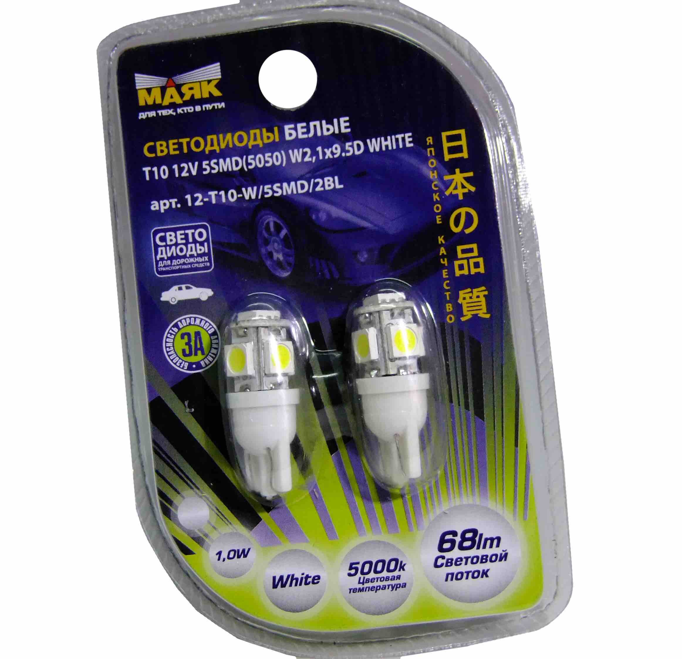Лампа светодиод 12V W2.1x9.5d T10 Маяк 5SMD(5050) белая 2шт 12T10-W\5SMD\2BL
