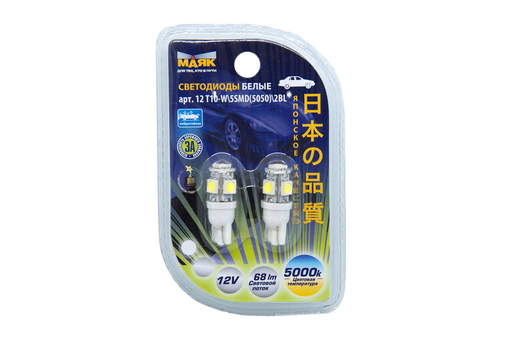 Лампа LED светодиодная 12V T10 5SMD W2,1x9.5d Маяк White 12T10-W/5SMD/2BL блистер 2шт.