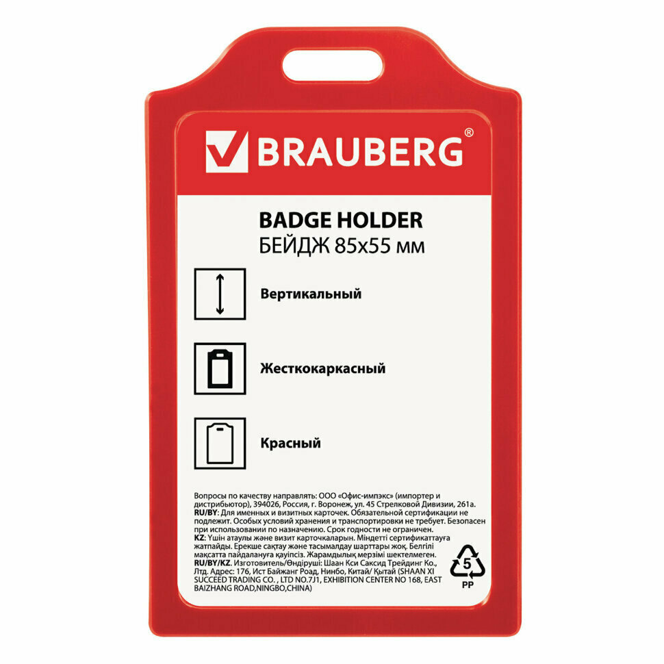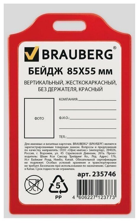 Бейдж вертикальный жесткокаркасный (85х55 мм), без держателя, красный, BRAUBERG, 235746 (арт. 235746)