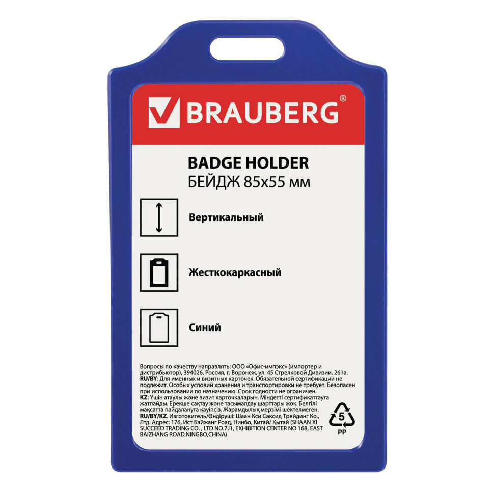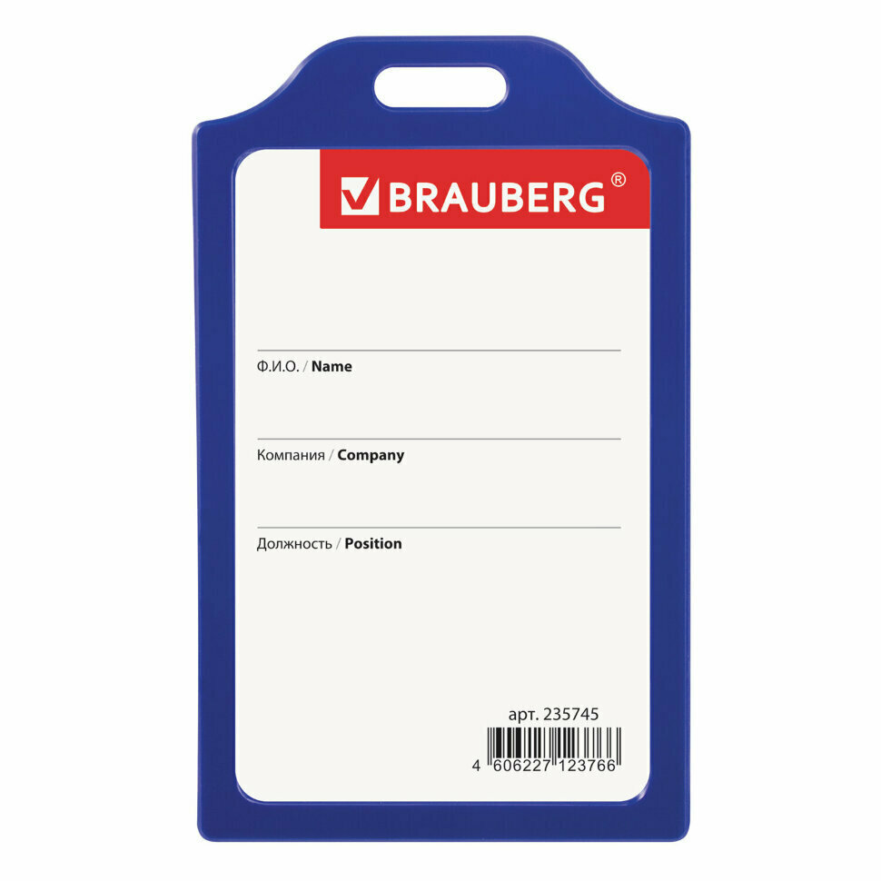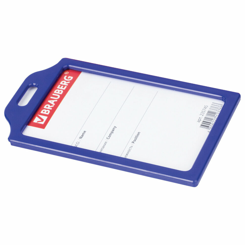 Бейдж вертикальный Brauberg, 85х55мм, твердый пластик, без держателя, синий (235745)