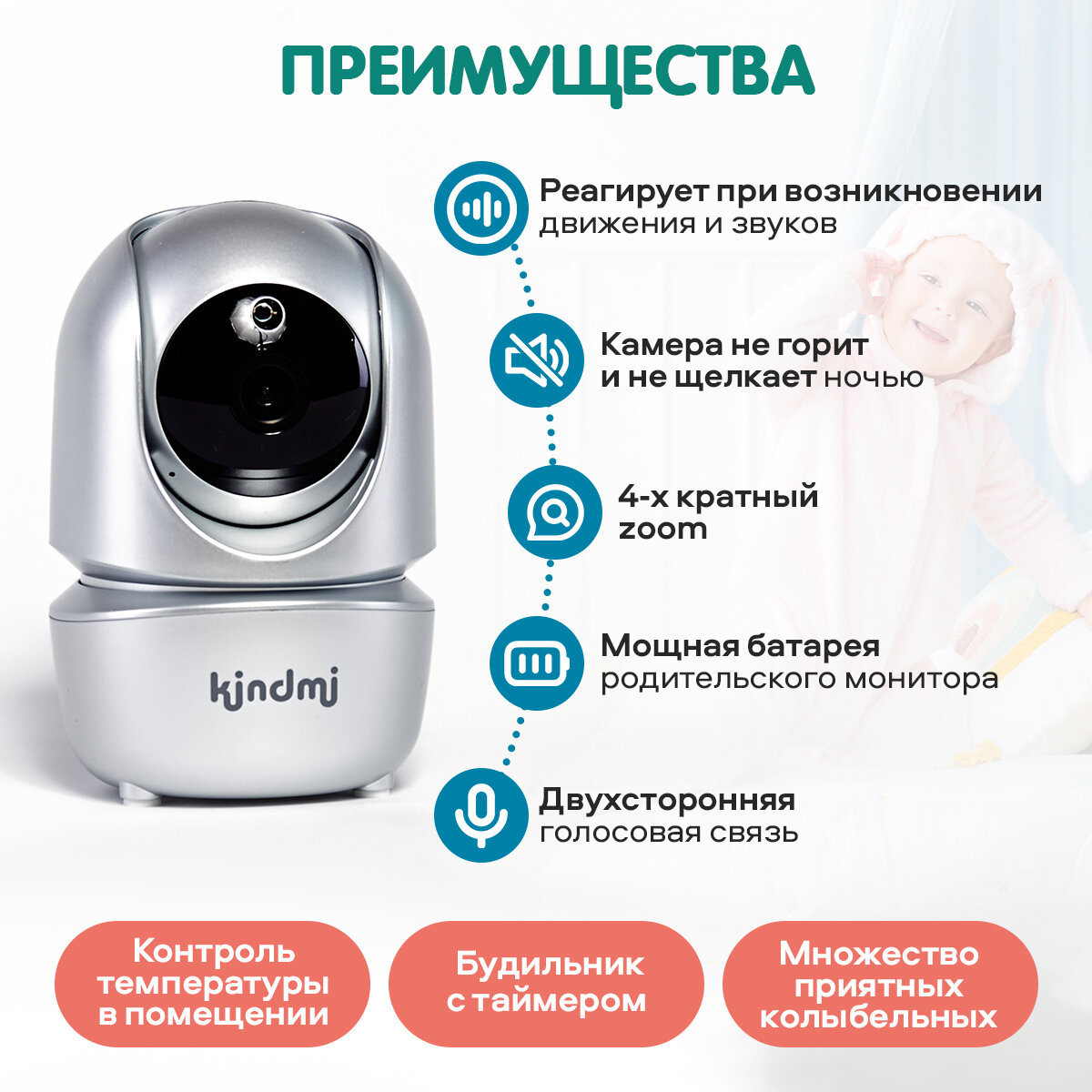 Видеоняня беспроводная поворотная с большим монитором 5 дюймов Kindmi интересное: