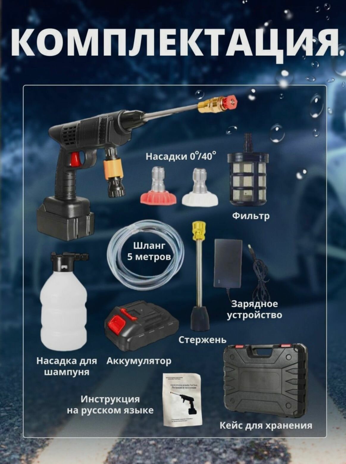| Дополнительная информация | Комплектация 1. Мойка высокого давления 2. Носик распылителя 3. Насадка 40° 4. Насадка 0° 5. Пульверизатор для автомобильного шампуня 6. Погружной фильтр тонкой очистки воды 7. Шланг подачи воды 8. 2 Аккумулятора 9. Блок питания аккумулятора 10. Кейс для хранения и переноски 11. Руководство пользователя |