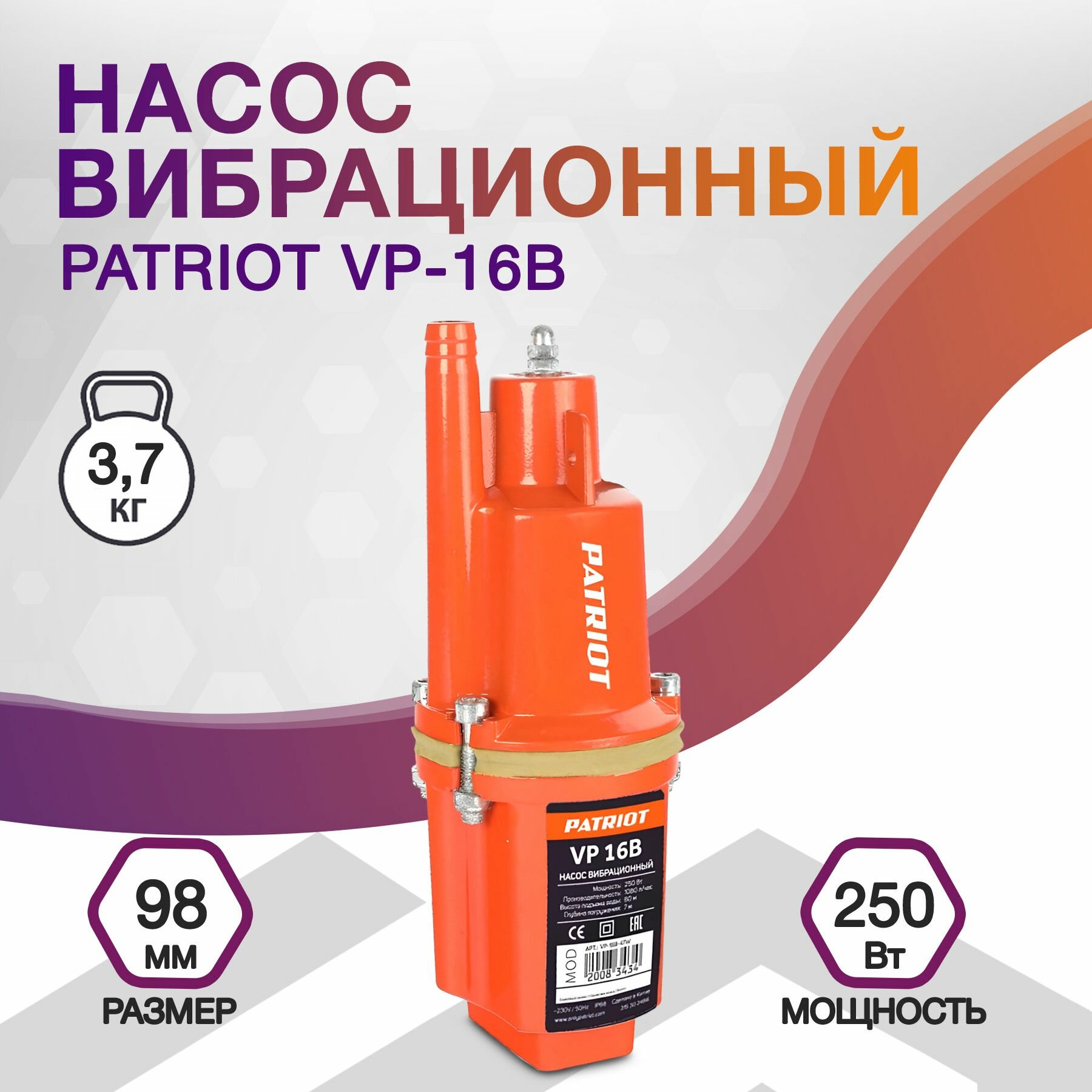 Насос погружной вибрационный PATRIOT VP 16В, верхний забор, кабель 16 м, 250 вт, 18 л/мин, H-60 м, D-96 мм. термозащита.