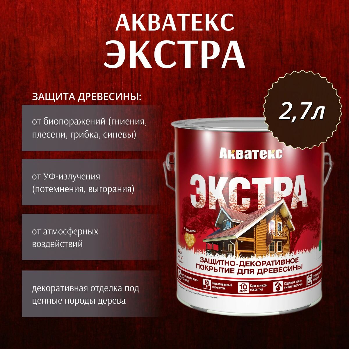 Защитно-декоративное покрытие для дерева Акватекс Экстра, полуглянцевое, 2,7 л, рябина