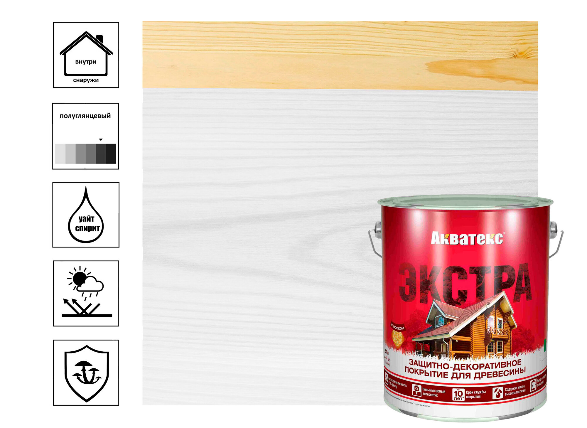 | Плюсы: | Хорошо ложится на очищенную древесину, быстро высыхает, не имеет резкого запаха. |