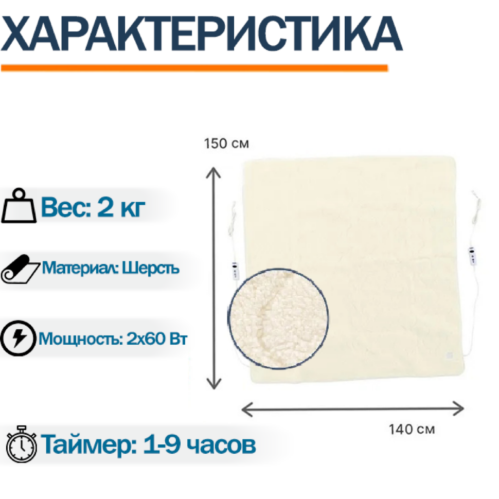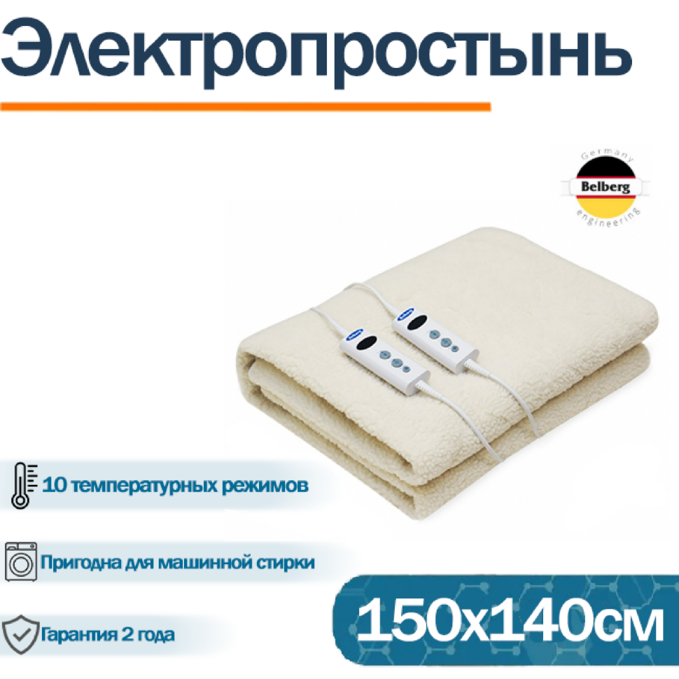 Электропростынь двуспальная Belberg BL-05 размер 150 см х 140 см, мощность 2х60 Вт, материал шерсть