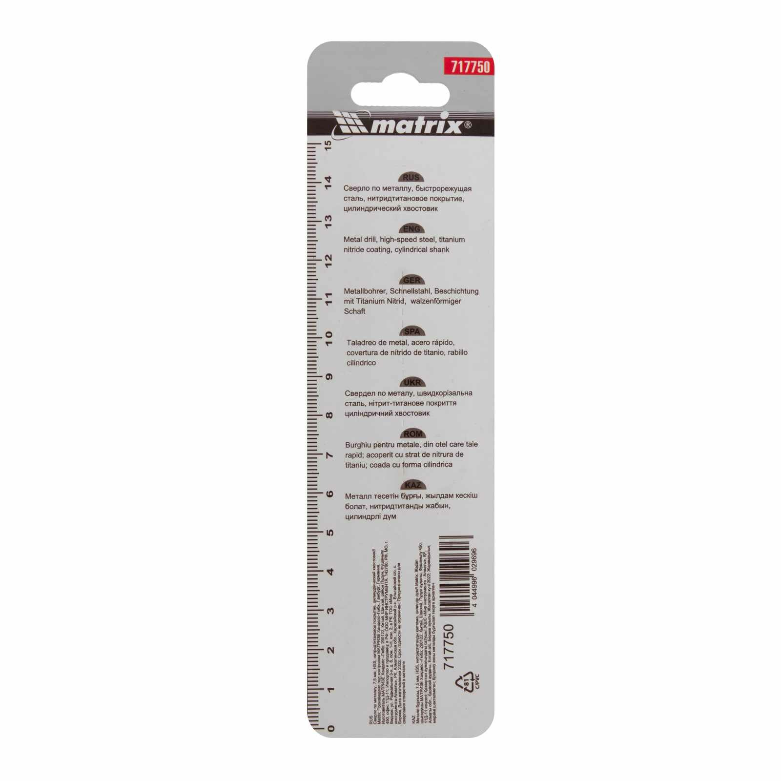 Сверло по металлу, 7.5 мм, HSS, нитридтитановое покрытие, цилиндрический хвостовик Matrix интересное: