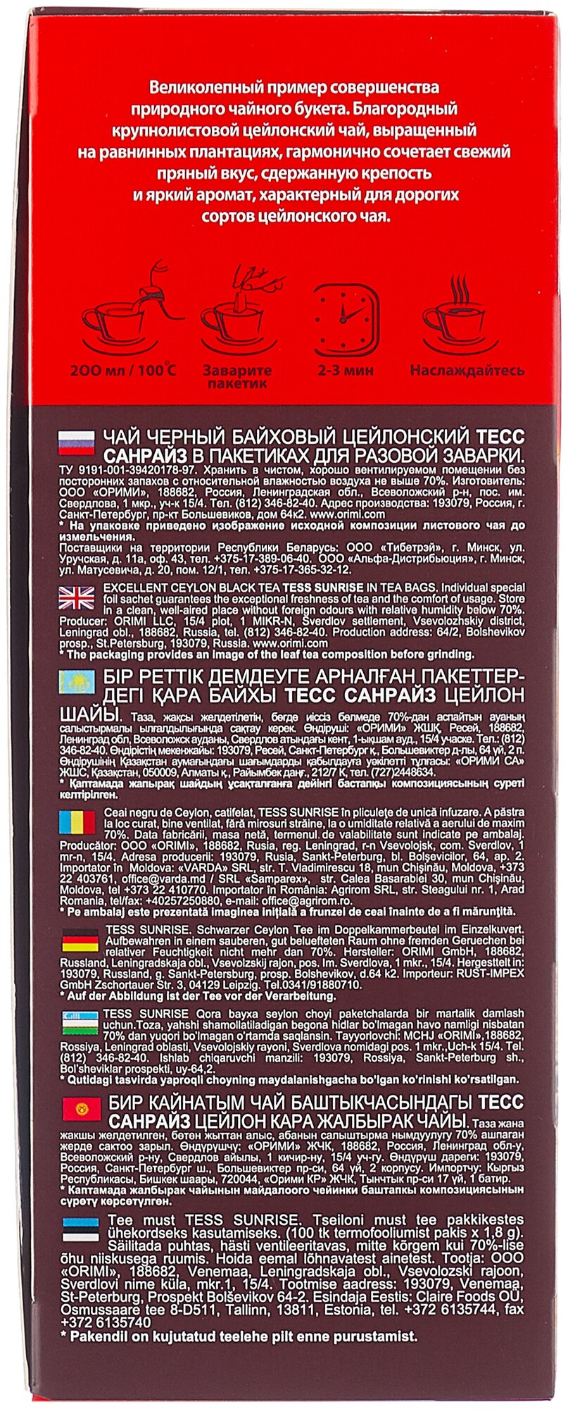 Чай TESS "Sunrise" черный цейлонский, 100 пакетиков в конвертах по 1,8 г,, 0918-09 В комплекте: 1шт.