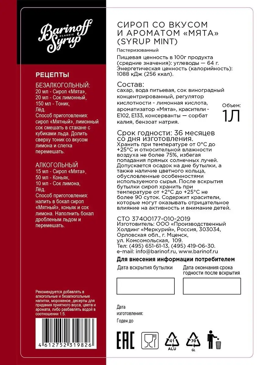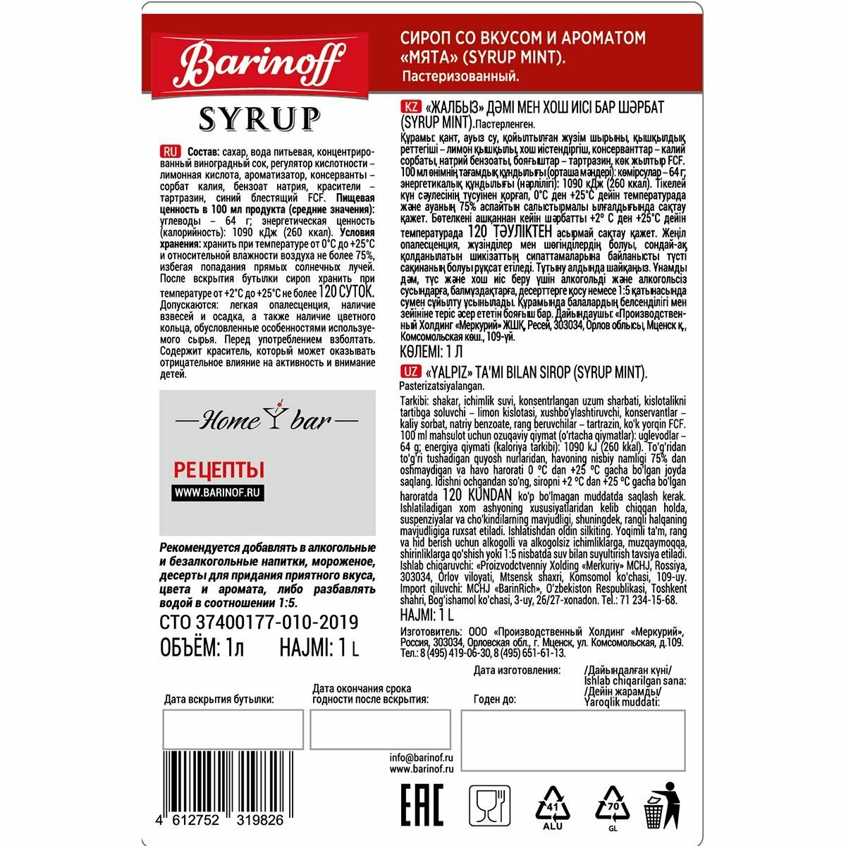 Баринофф Сироп Мята 1л.*1шт. Barinoff