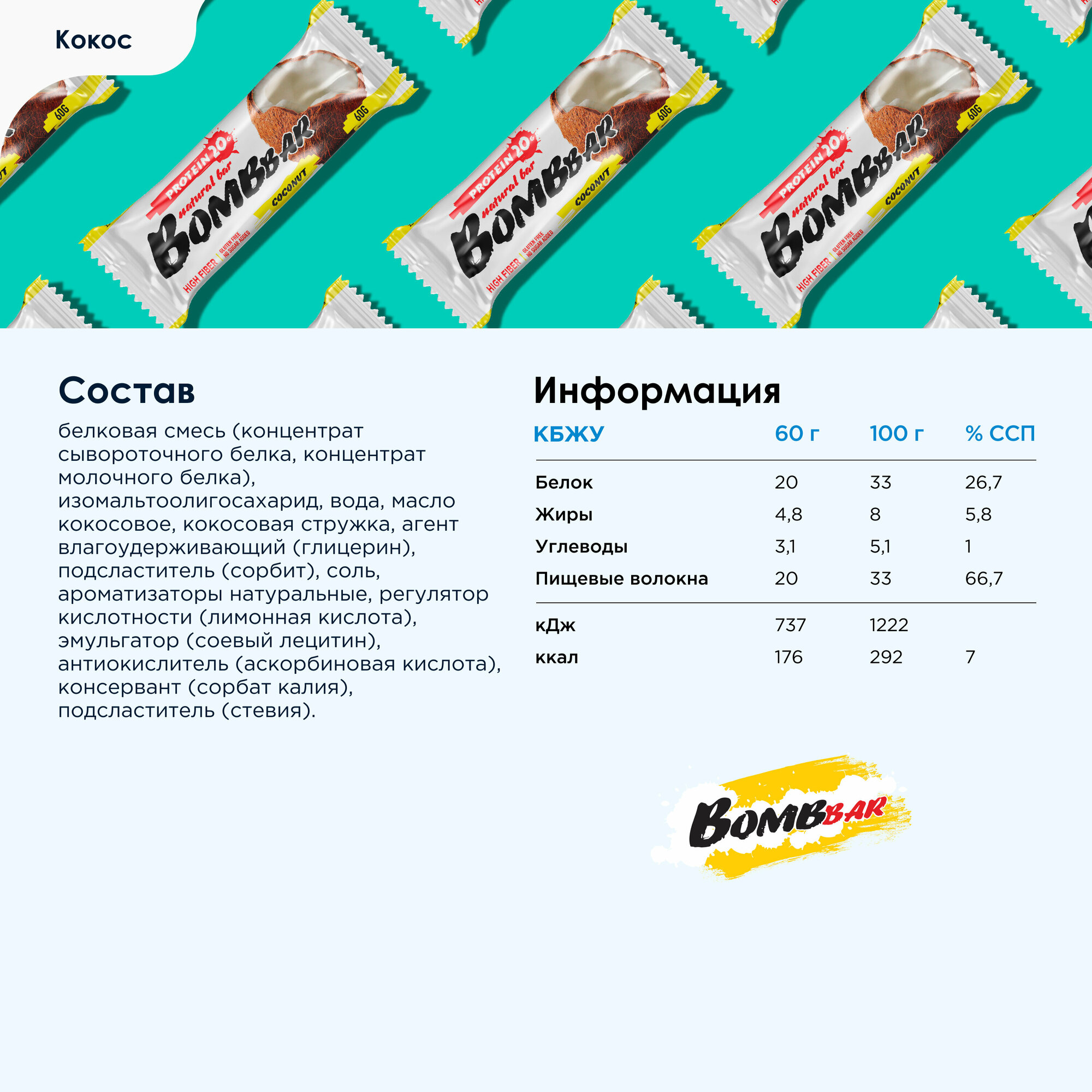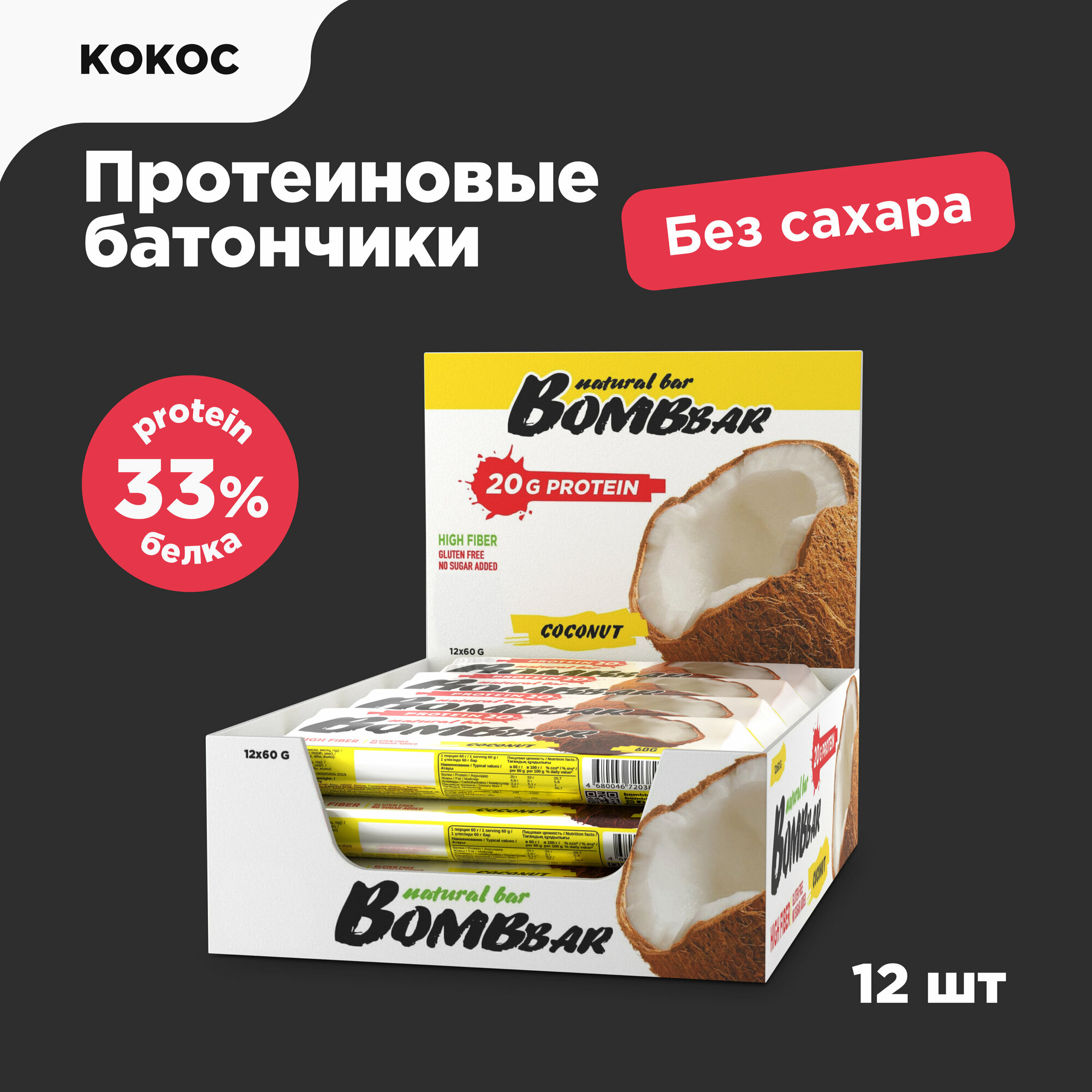 Bombbar Набор батончиков неглазированных протеиновых, вкус кокос 20 штук по 60 г