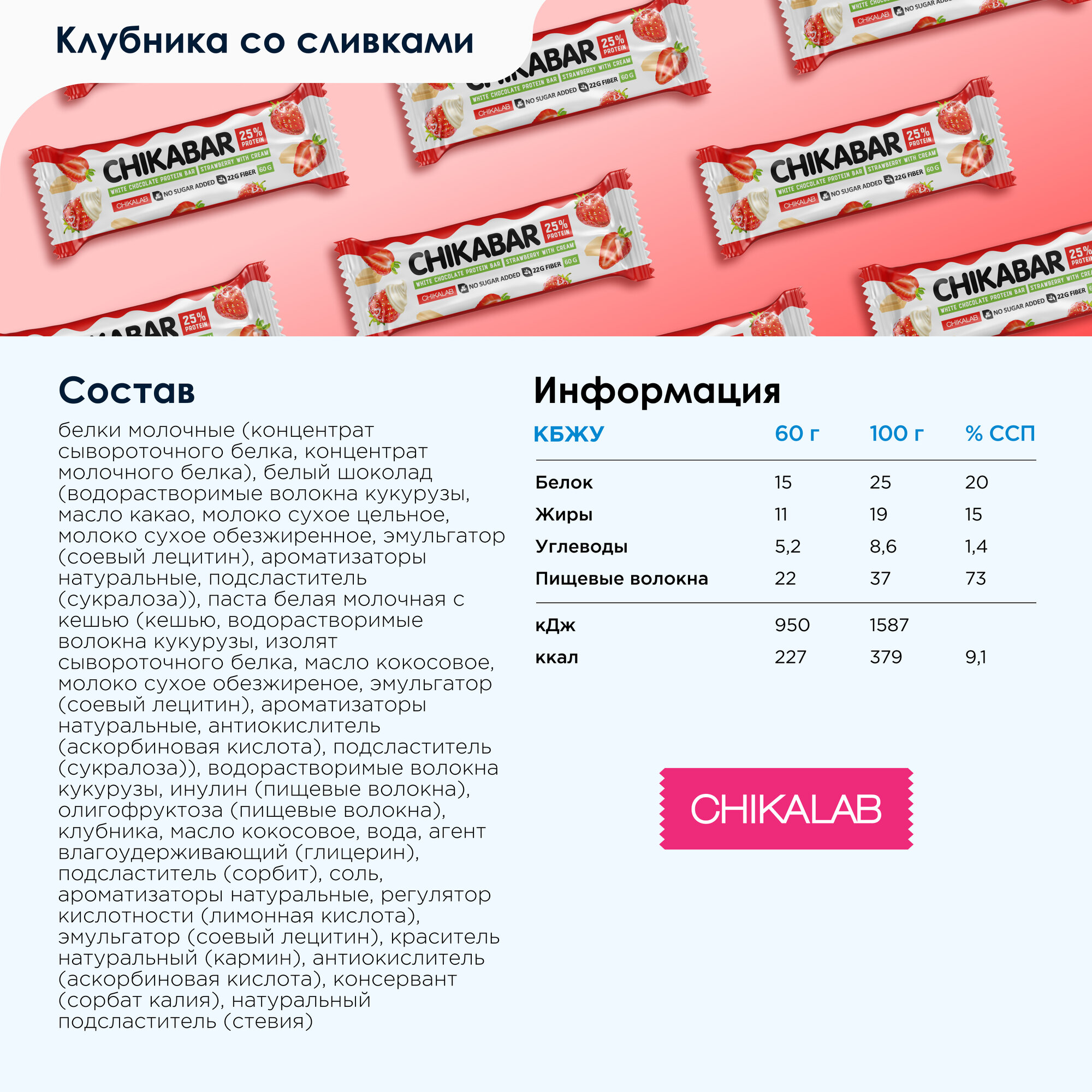 Протеиновый батончик CHIKALAB ChikaBar, Клубника со сливками (20шт по 60г)