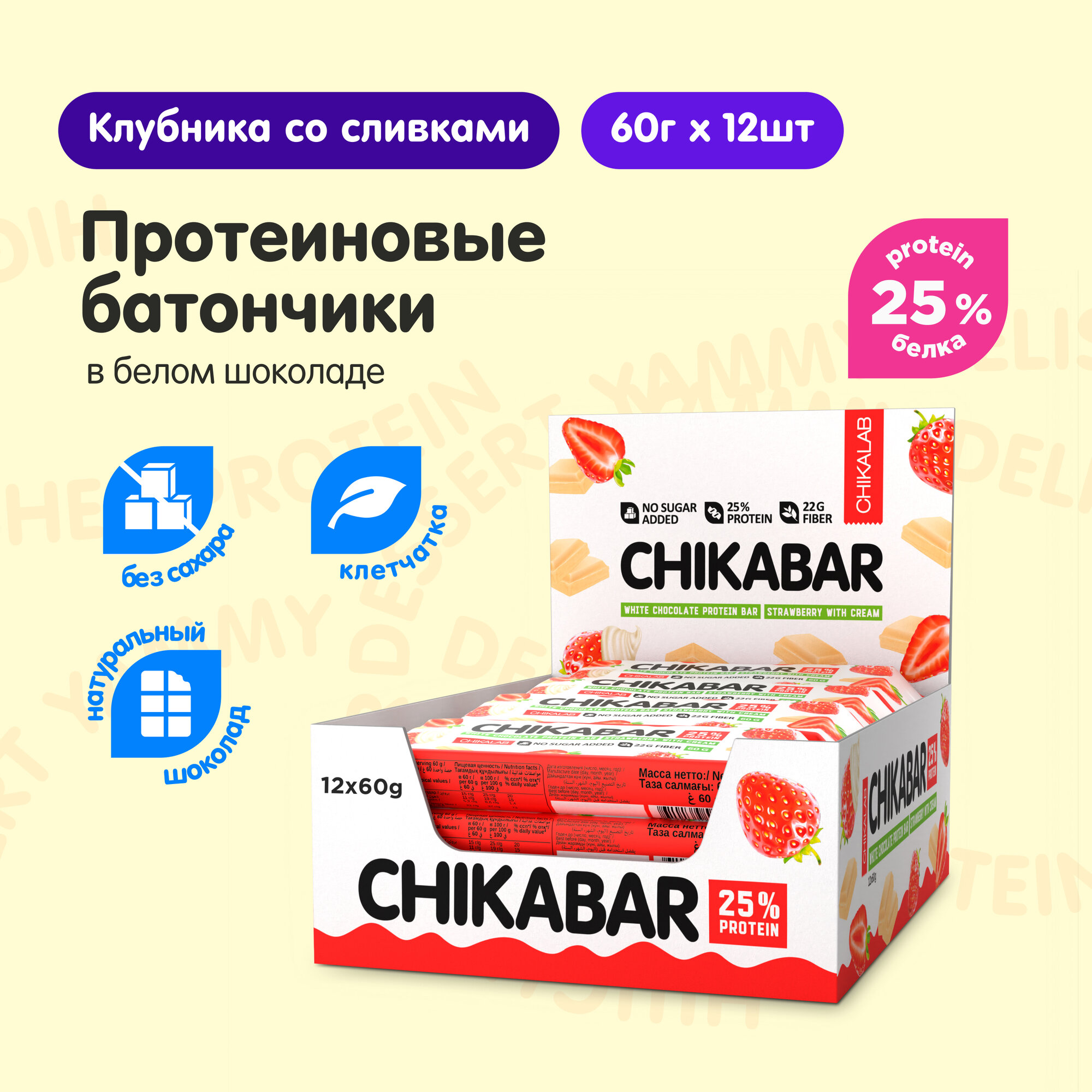 Купить CHIKALAB CHIKABAR Протеиновые батончики в белом шоколаде без сахара Клубника со сливками, 12шт х 60г