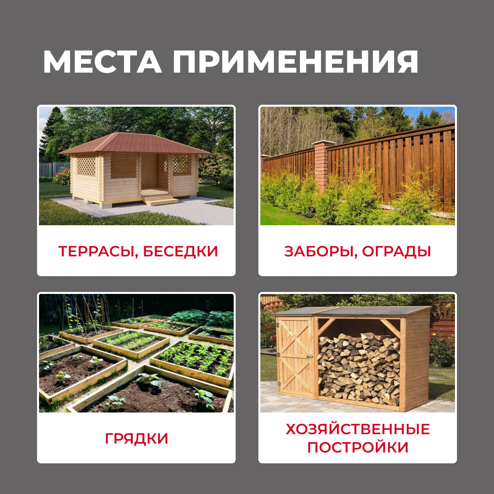 | Область применения | для дверей / для заборов / для окон / для садовой мебели / для фасадов |