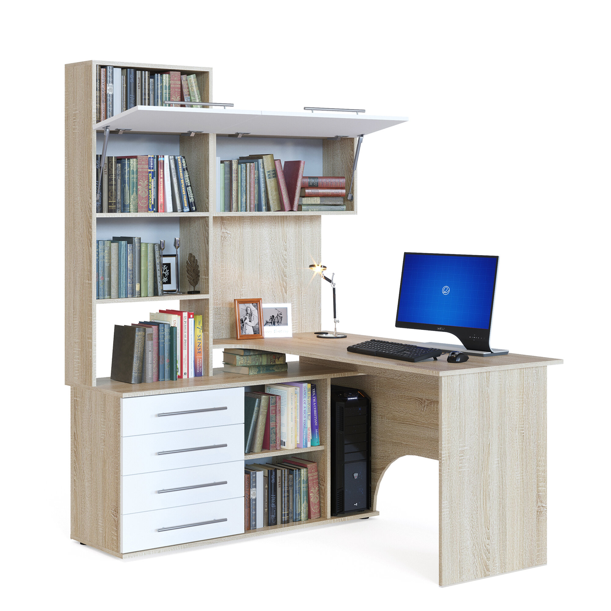 Стол компьютерный КСТ-14Л левый, цвет дуб сонома/белый, ШхГхВ 140х124х183 см., выдвижные ящики слева, стол с тумбой и надстройкой