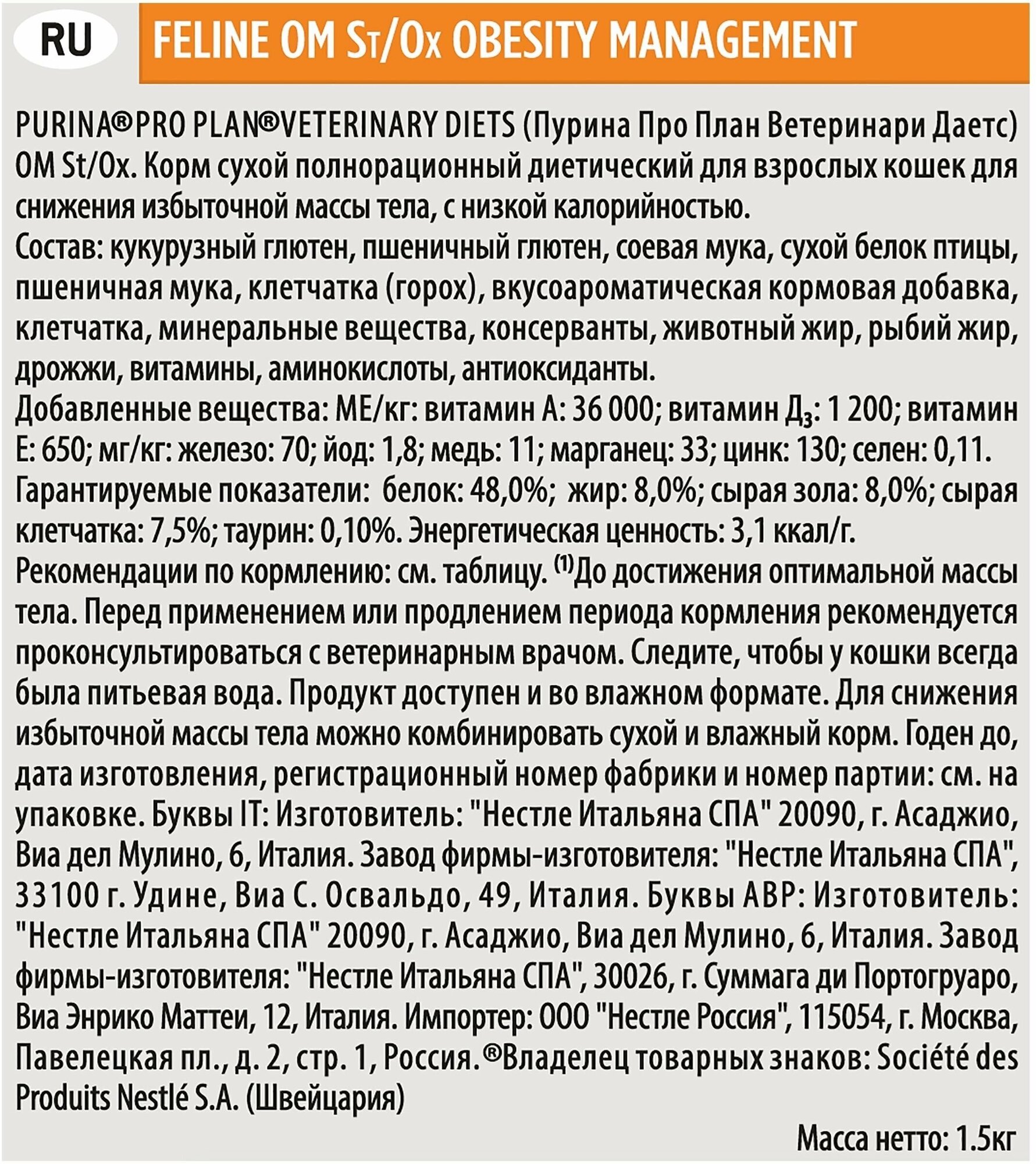 PURINA VETERINARY DIETS OM ST/OX OBESITY для взрослых кошек при ожирении (1,5 кг)