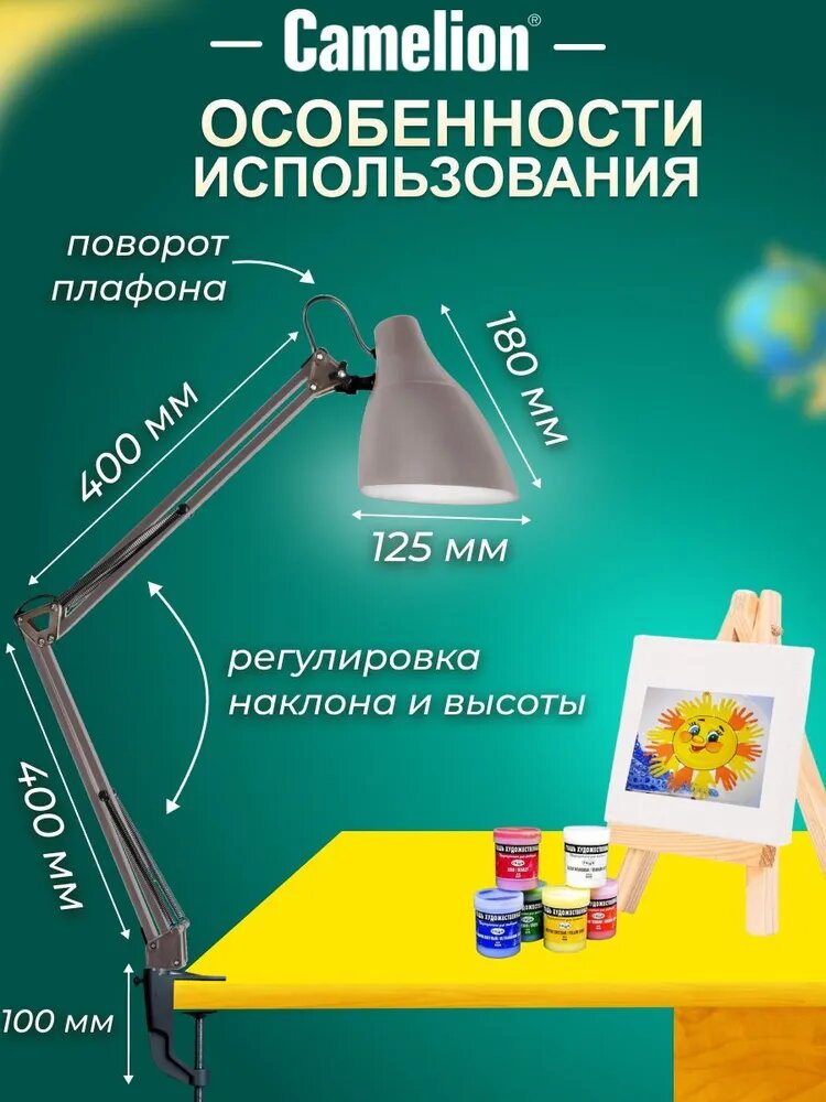 Светильник Camelion Металлическая струбцина, KD-335, 40 Вт, E27, серый (13881)