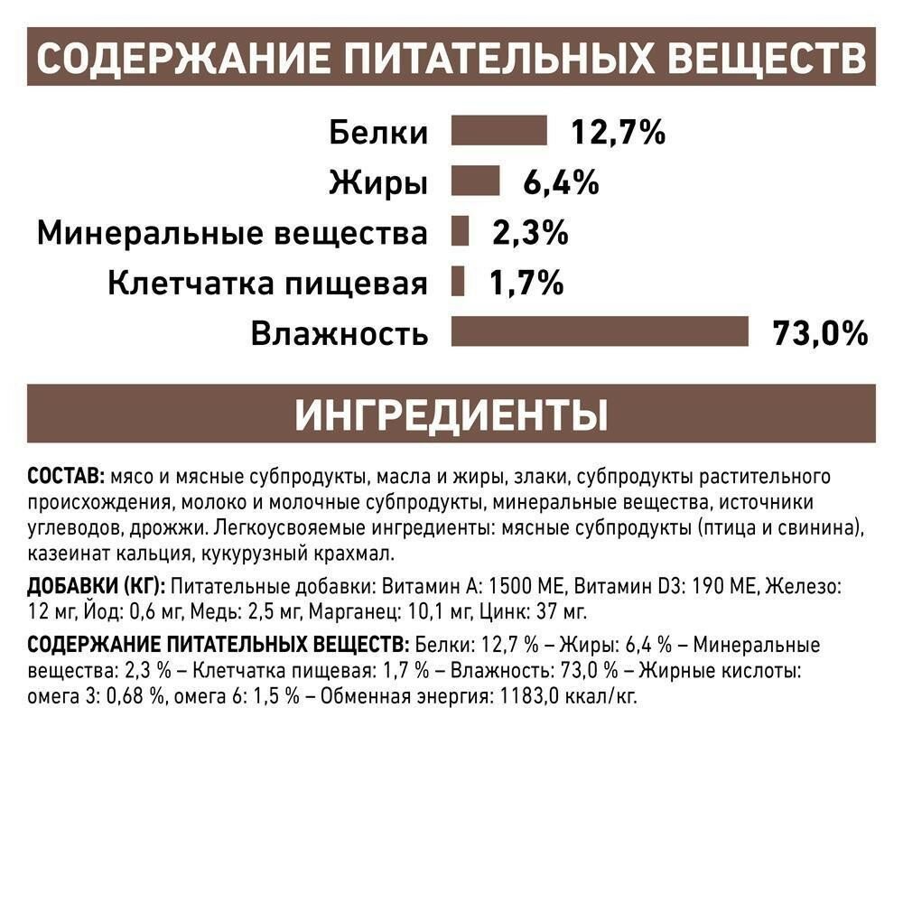 | Состав | печень птицы, свинина, мясо птицы, обработанный кукурузный крахмал, целлюлоза, казеинат кальция, рыбий жир, минеральные вещества, сухой яичный белок, подсолнечное масло, таурин, каррагенан, фруктоолигосахариды (ФОС), экстракт бархатцев прямостоячих (источник лютеина), семена подорожника, гидролизат дрожжей (источник маннановых олигосахаридов), DL-метионин, микроэлементы (в т.ч. в хелатной форме), витамины |