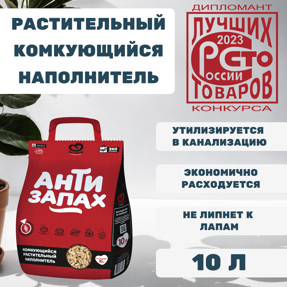 Впитывающий растительный наполнитель для кошачьего туалета Антизапах 10л. Питомец