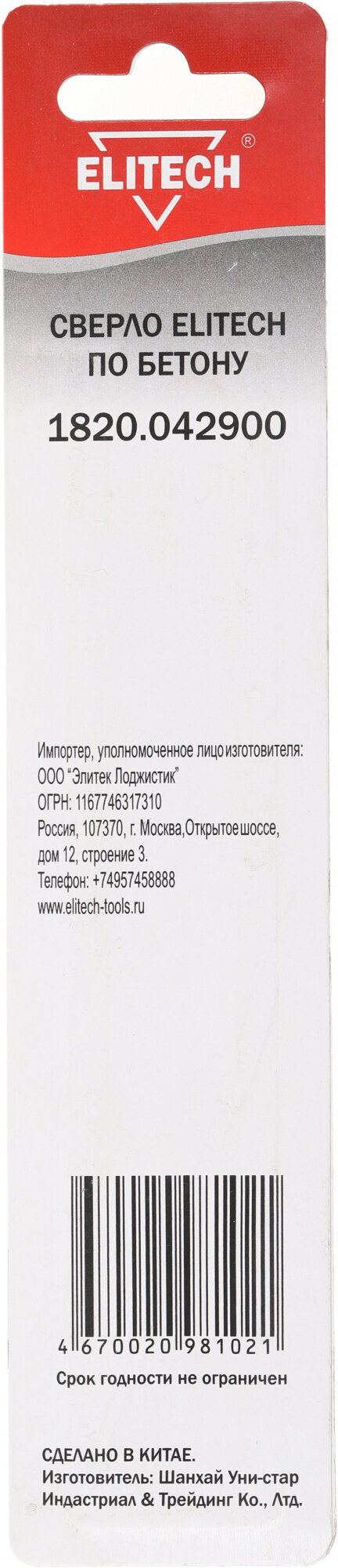 Сверло Elitech 1820.042900, по бетону, 6мм, цилиндрический, 1шт интересное: