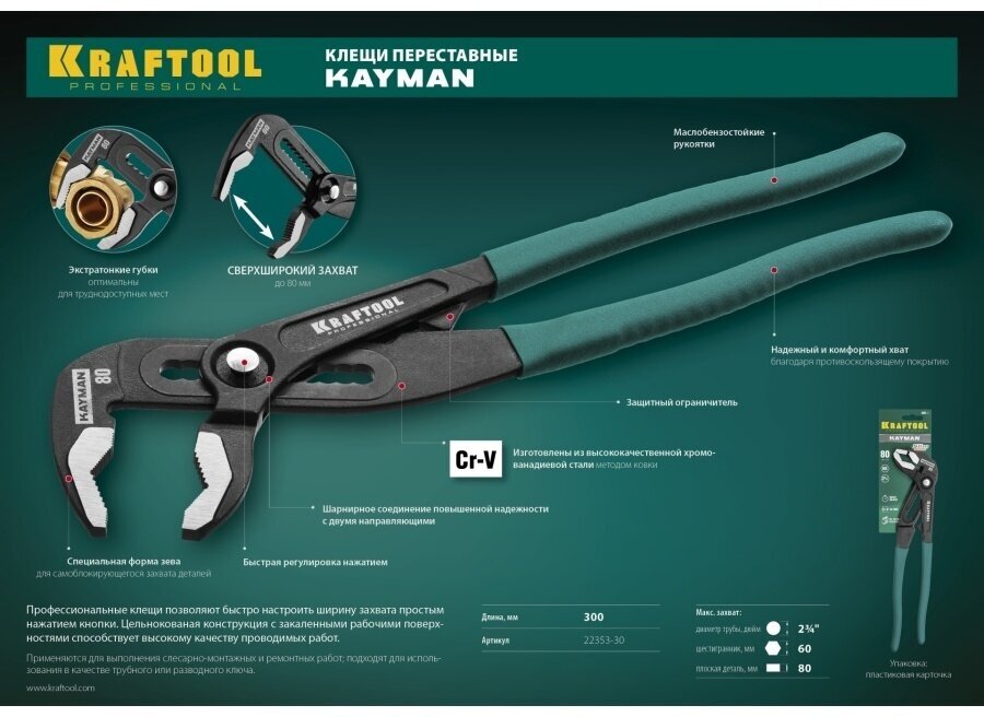 Клещи переставные "KAYMAN", быстрая регулировка, Cr-V, max захват до 80 мм, 300мм, KRAFTOOL ( интересное: