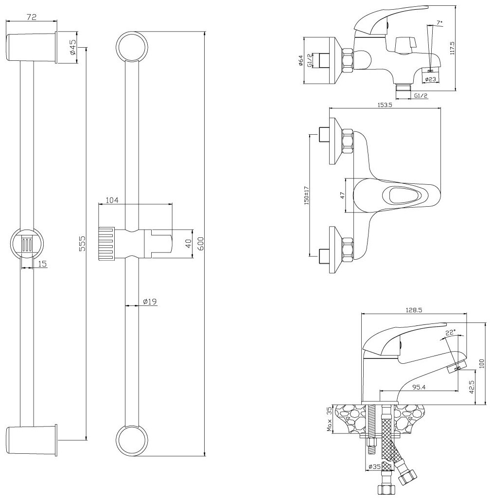 | Дополнительная информация | комплект включает смеситель для умывальника, смеситель для ванны и душа; высота стойки для душа: 600 мм |