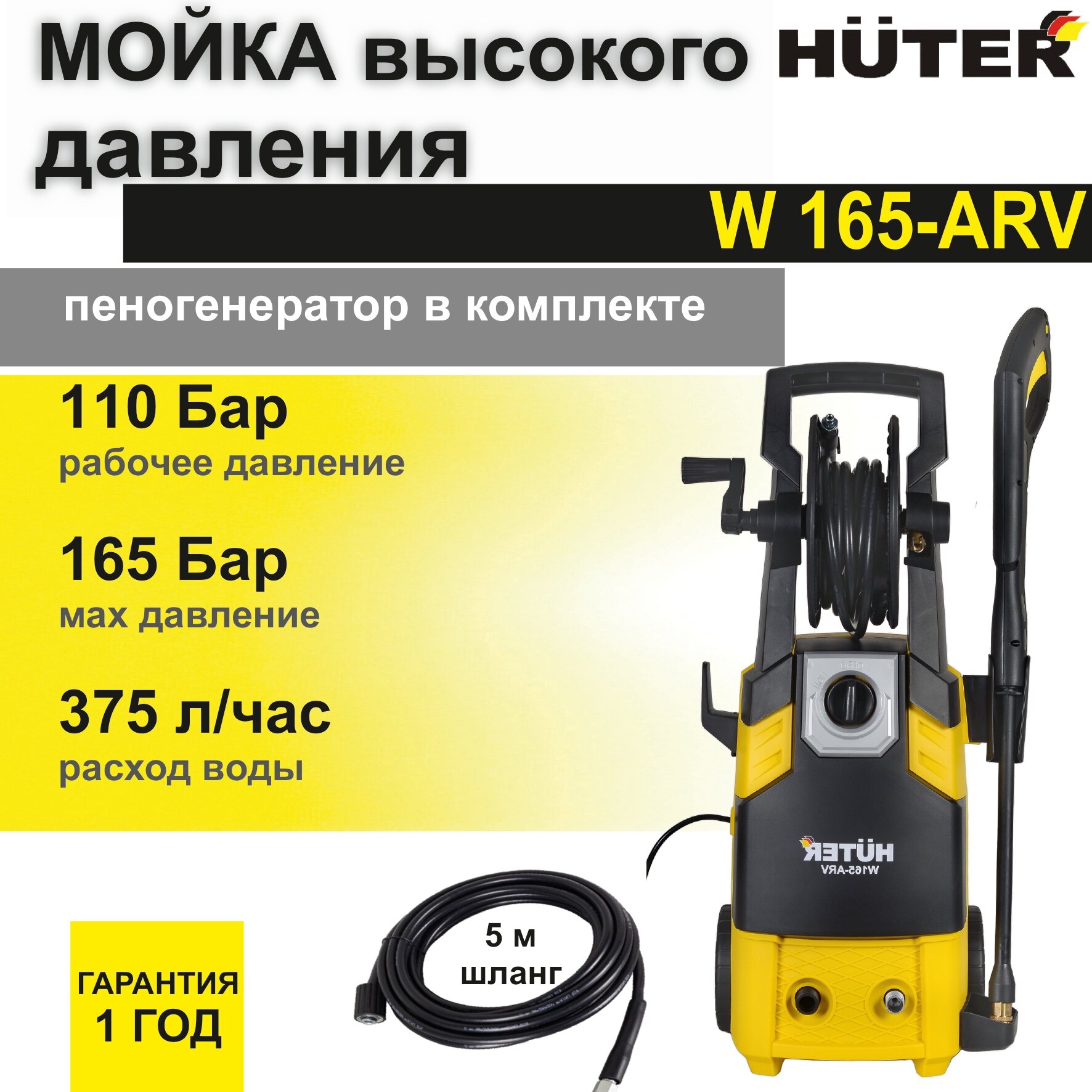 Мойка высокого давления Huter W165-ARV (165 бар, шланг 5 м, 1900 Вт, 375 л/ч , встроенный пеногенератор) автомойка / минимойка / для дома и дачи интересное: