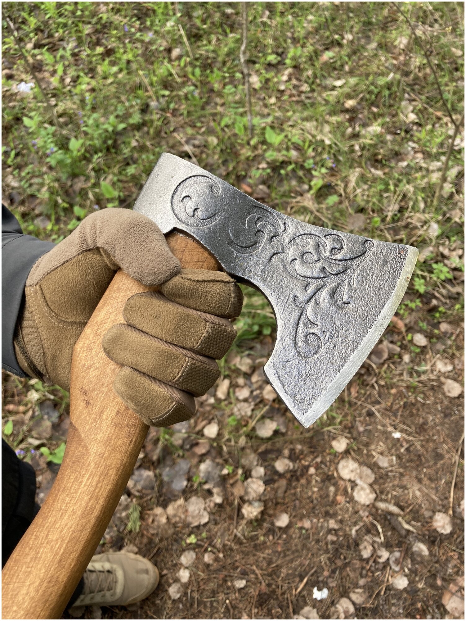 | Отзыв: | Топор красивый, но тем не менее монументальный, увесистый. Рисунок протравлен на столько глубоко, что даже при агрессивном использовании не потеряет контуры. Лезвие выведено, но не заточено. И это хорошо, потому что каждому нравится свой угол заточки под разные цели. Я подарю так, точить не буду, потому что будущий владелец умеет это делать лучше меня. Фаски все сняты, нигде ничего не режет, местами даже гладкий, но в зеркало не заполирован, всё таки им надо работать. У меня рука не такая большая,но хват удобен, соответственно другому человеку,с рукой побольше вообще чётко будет. Металл при ударе звенит, но не сильно, думаю, закалка приемлемая. При попадании топором в гвоздь кусок отколоться не должен. Рукоять пропитана классно, фактурная, не отполирована гладко, чтоб не скользило. Клин металлический. Ручка пахнет маслом и деревом, чехол - кожей. Натуральность зашкаливает. |