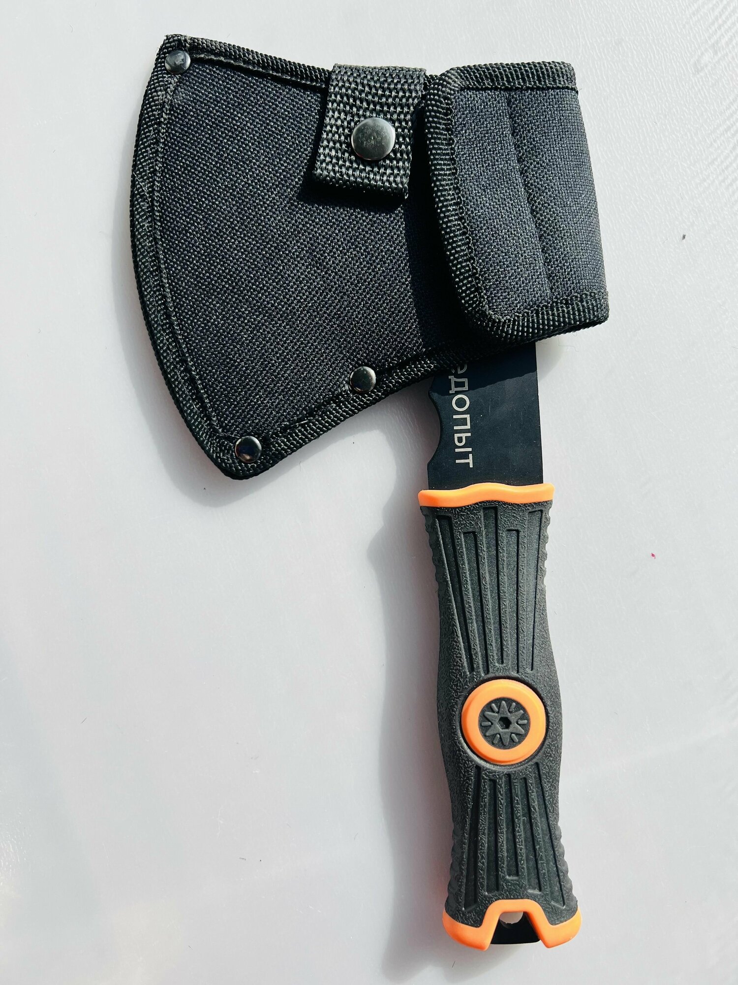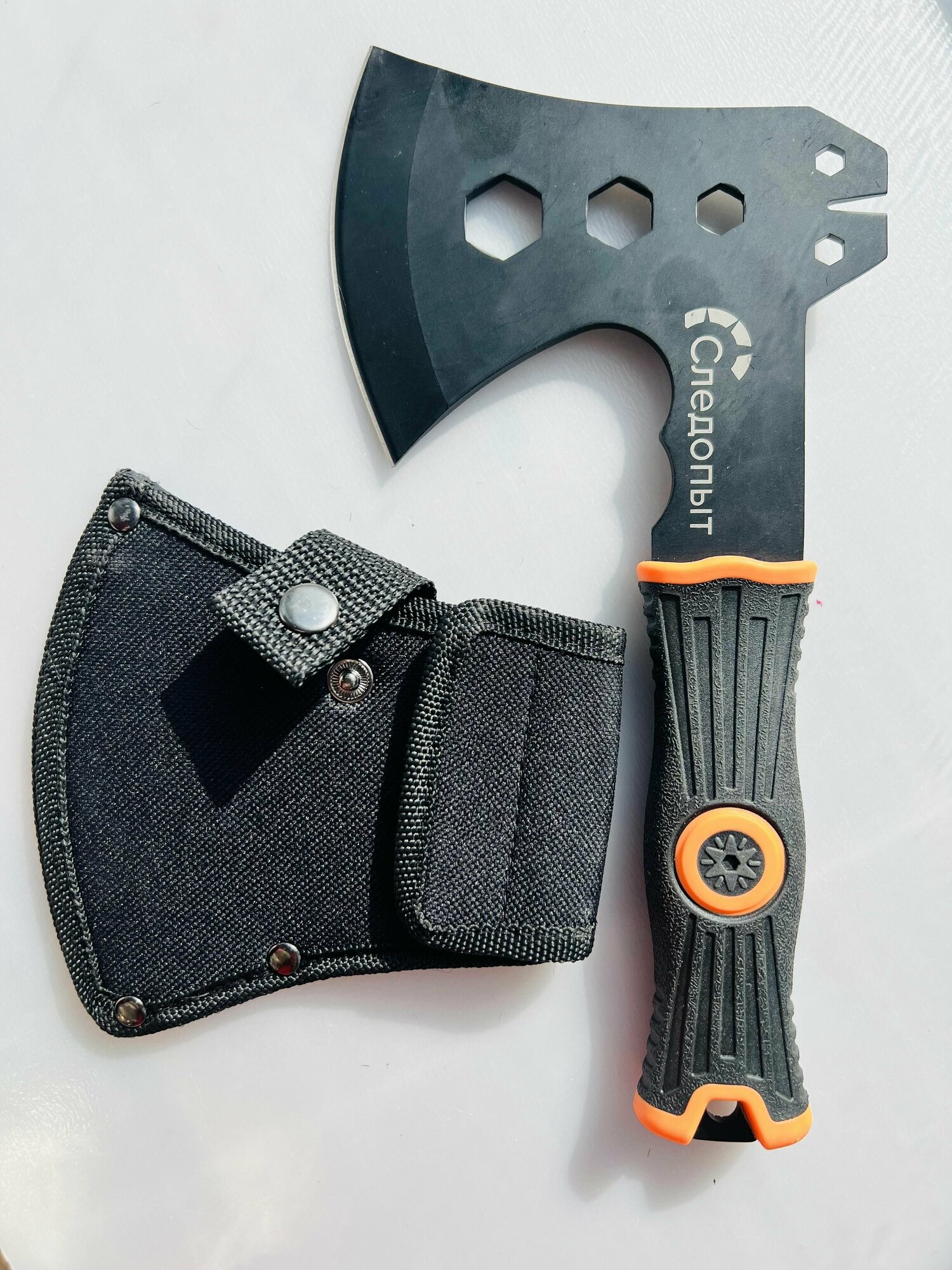 Топор туристический следопыт 240*130*85 мм, 350 гр, в чехле, черный с оранжевыми вставками