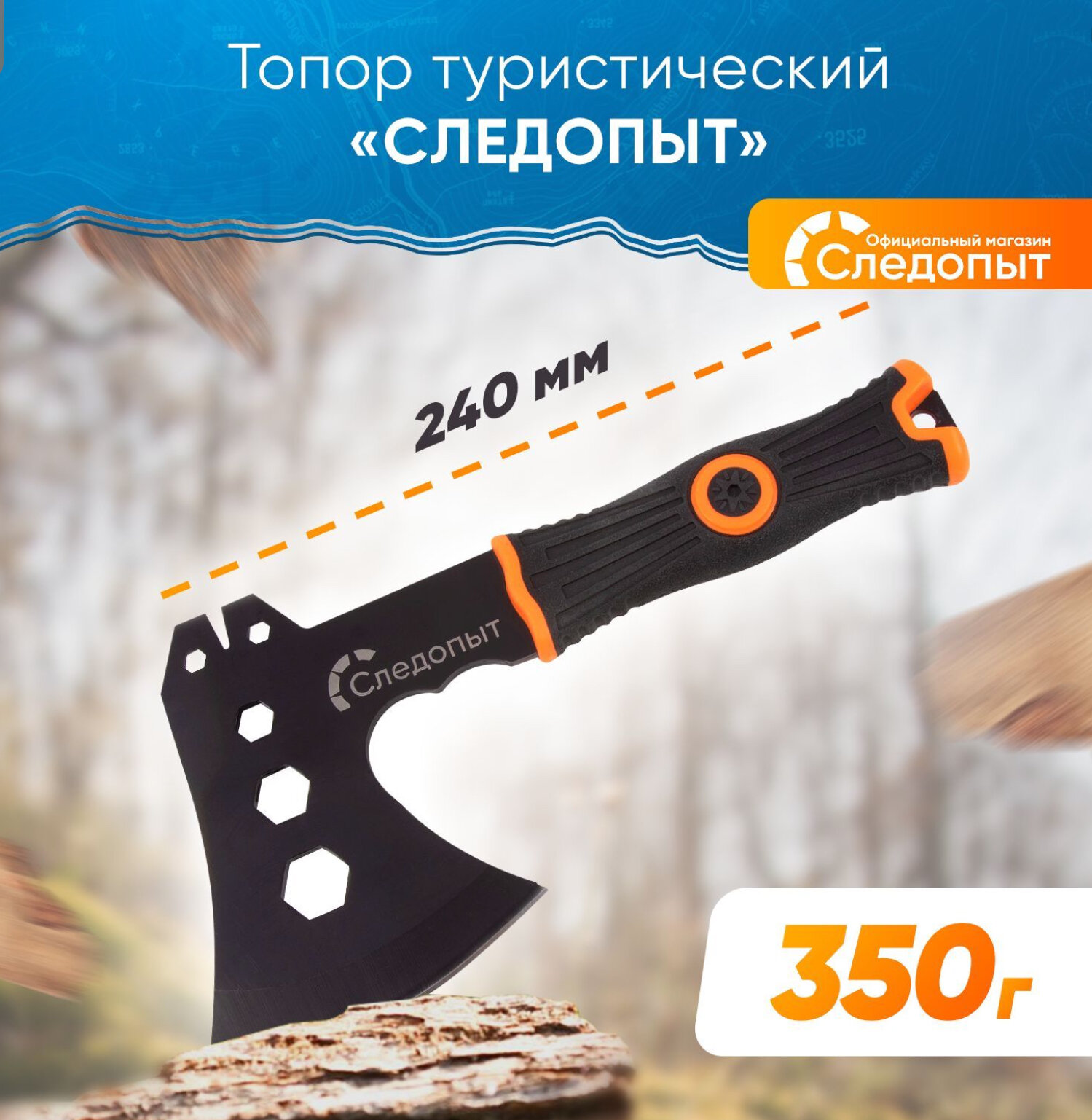 Топор туристический "следопыт" 240*130*85 мм, 350 гр., черный c оранжев. вставками, в чехле интересное: