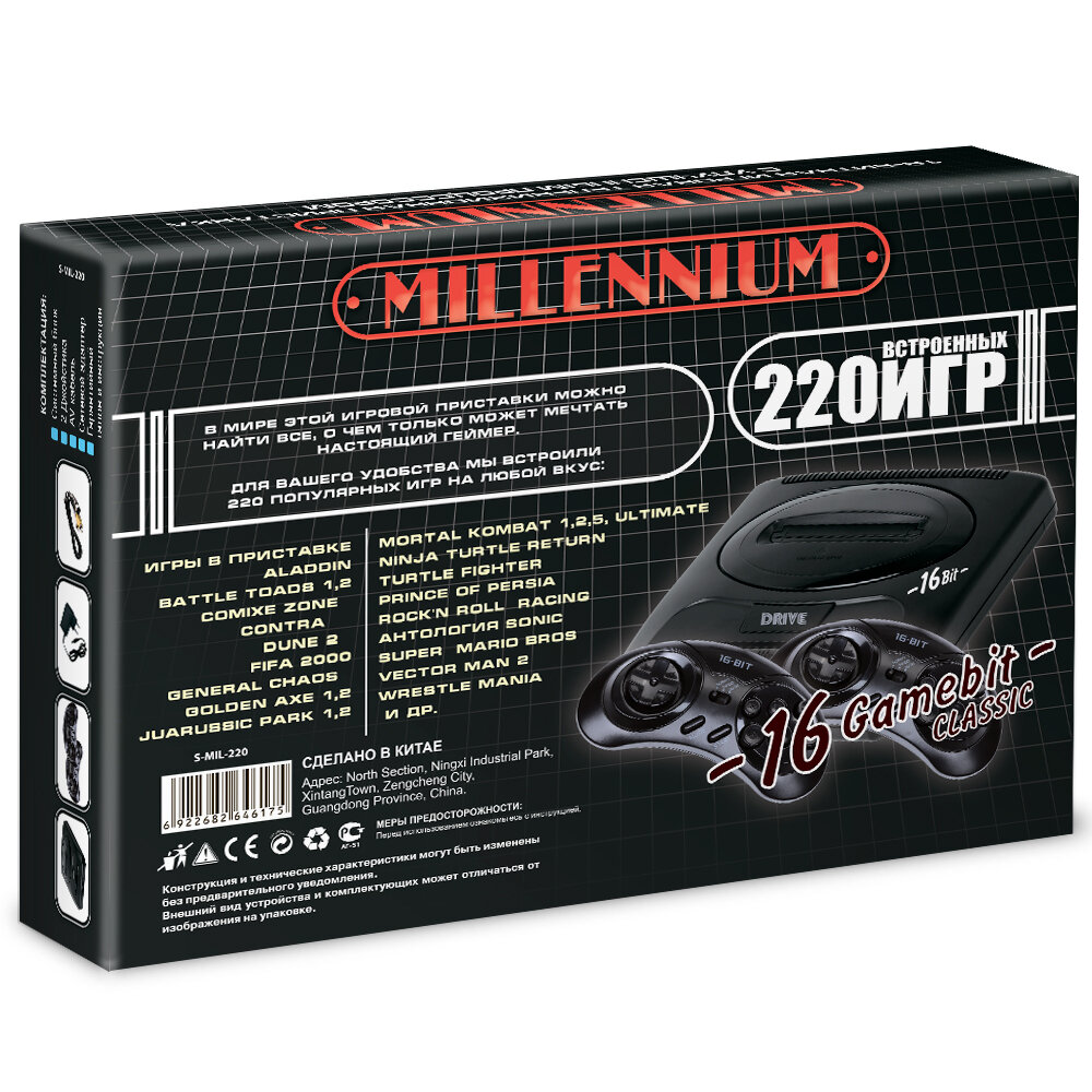 Игровая приставка 16 bit Super Drive Classic Millennium (220 в 1) + 220 встроенных игр + 2 геймпада (Черная)
