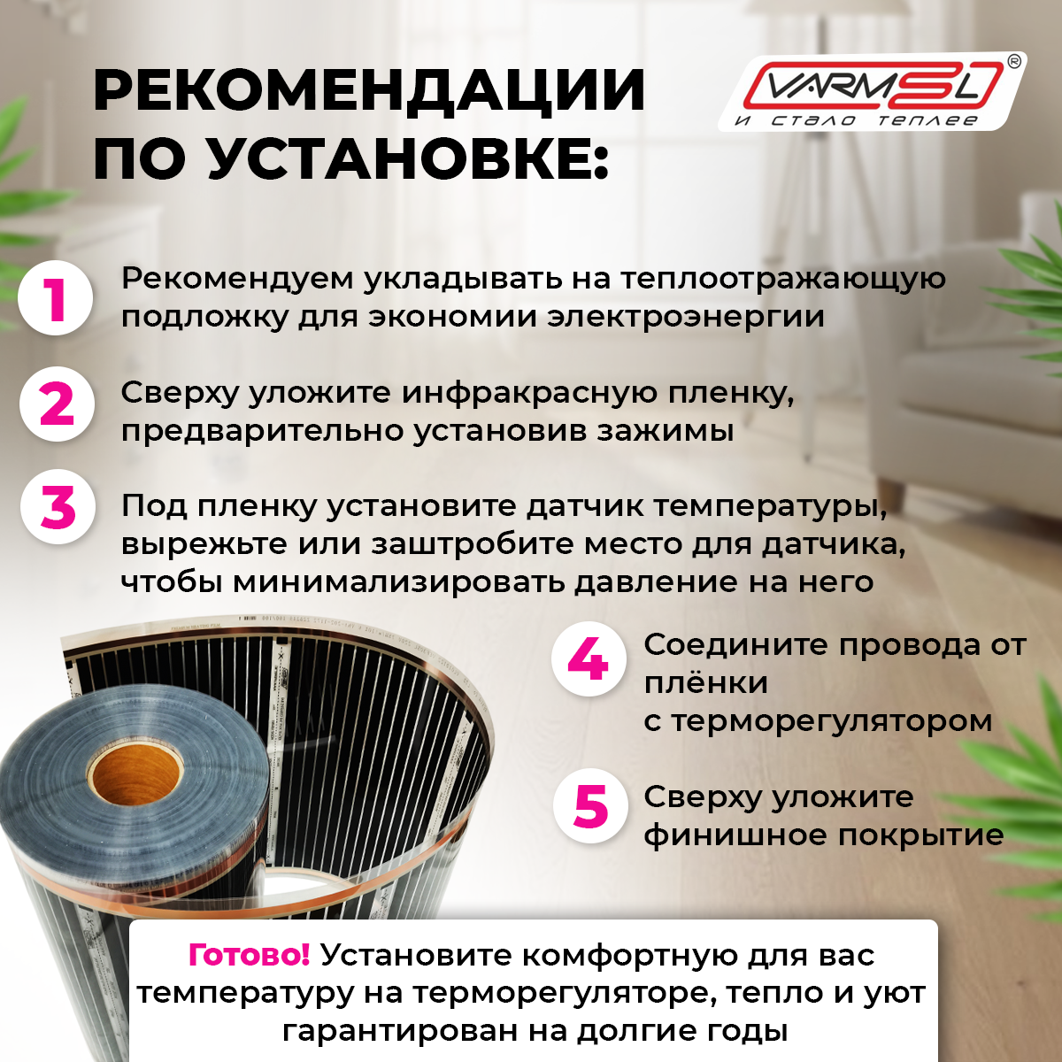 Пленочный теплый пол Varmel ширина 80см длина 6 м.п. / 1056 Вт