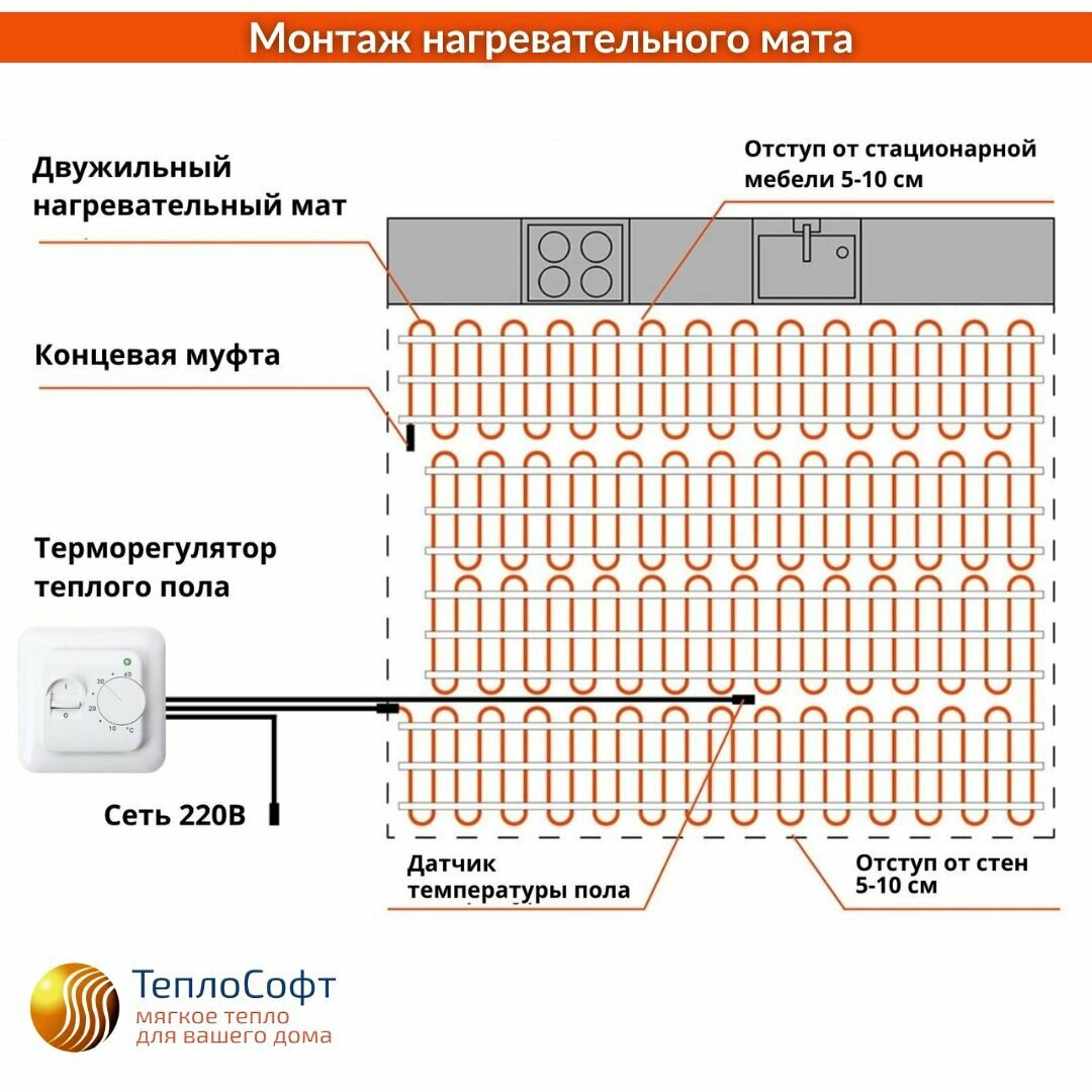 Тёплый пол электрический нагревательный мат Теплософт Профи 0,5 м2 с сенсорным терморегулятором