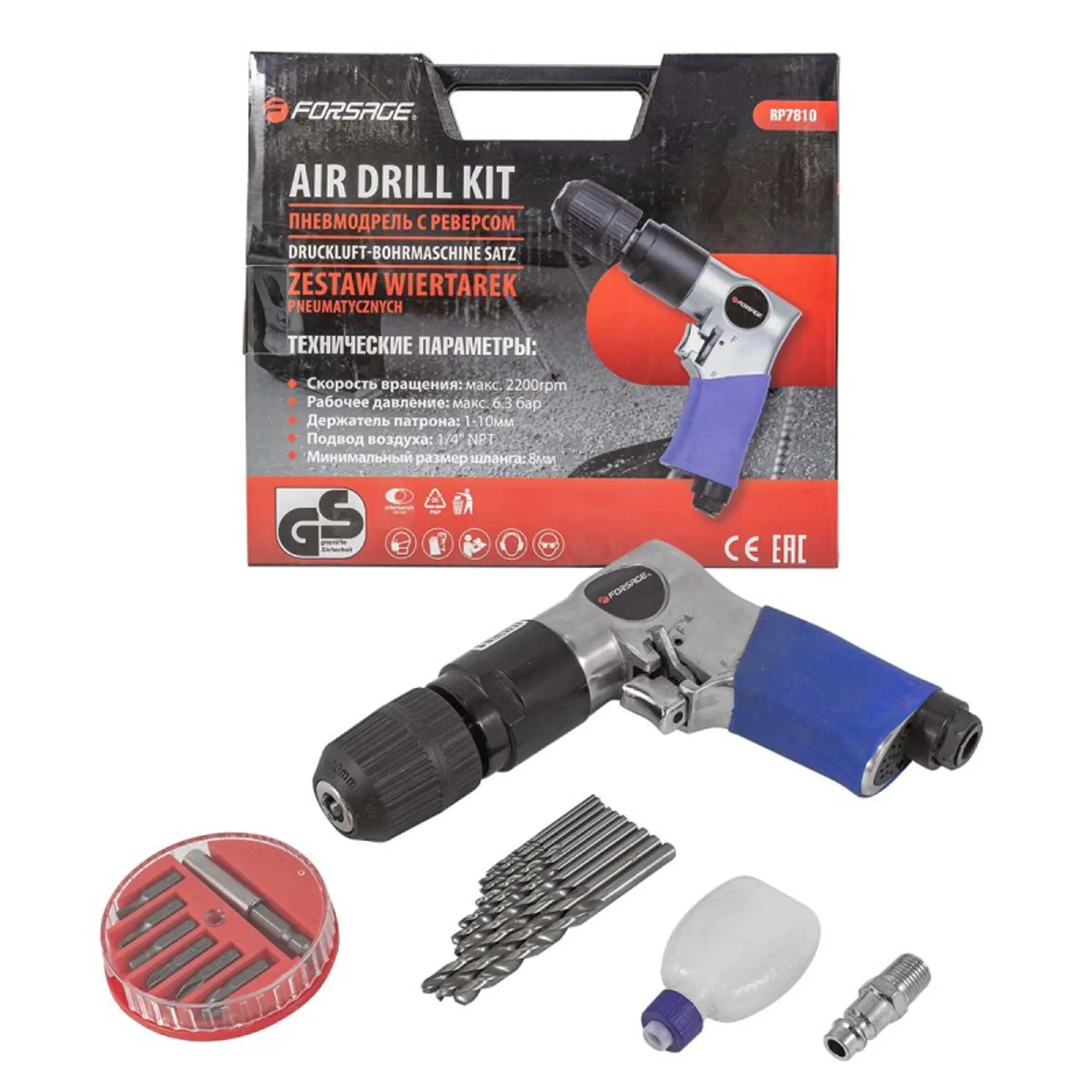 FORSAGE F-RP7810 Пневмодрель 2200 об/мин, 6.3 бар, быстрозажимной патрон 1-10 мм, штуцер 1/4 inch, с реверсом, набором бит и сверл (20 пр)
