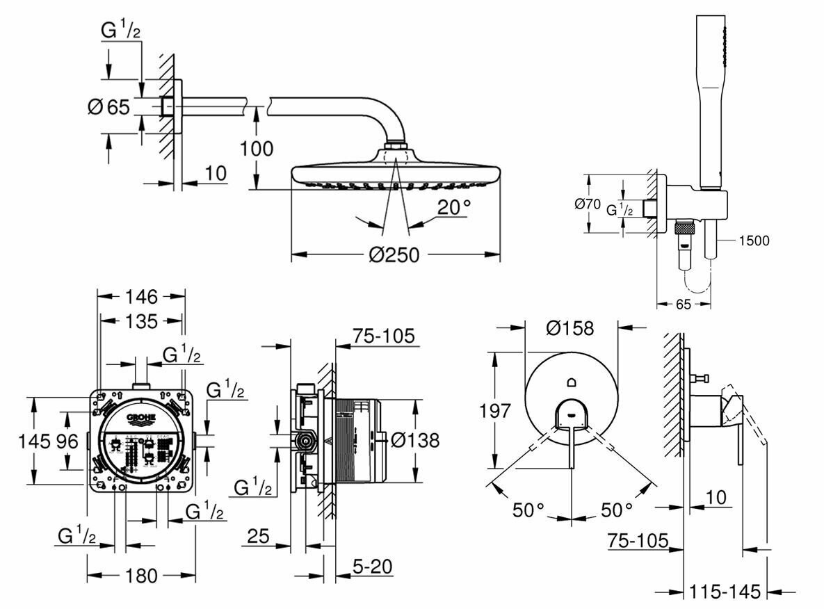 Душевая система с тропическим душем Grohe Plus Professional 250, Германия интересное: