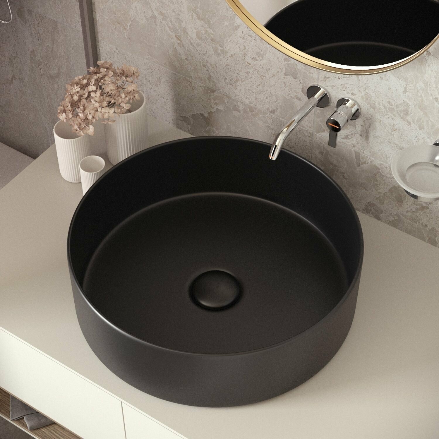Готовое решение: раковина накладная/встраиваемая сверху Helmken 49941001, сифон с донным клапаном Rea, ширина умывальника 41 см, черный цвет интересное: